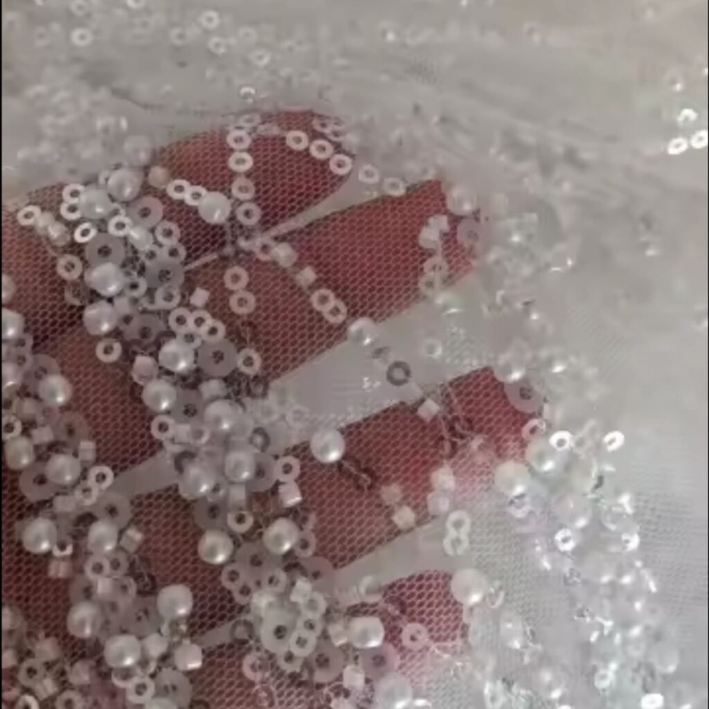 Transform your designs with this Luxurious Beaded Lace Fabric, a stunning blend of elegance and sophistication. Designed with meticulous attention to detail, this fabric features pearl-embroidered lace and intricate beading, making it the perfect choice for crafting wedding dress fabric and other high-fashion garments.
