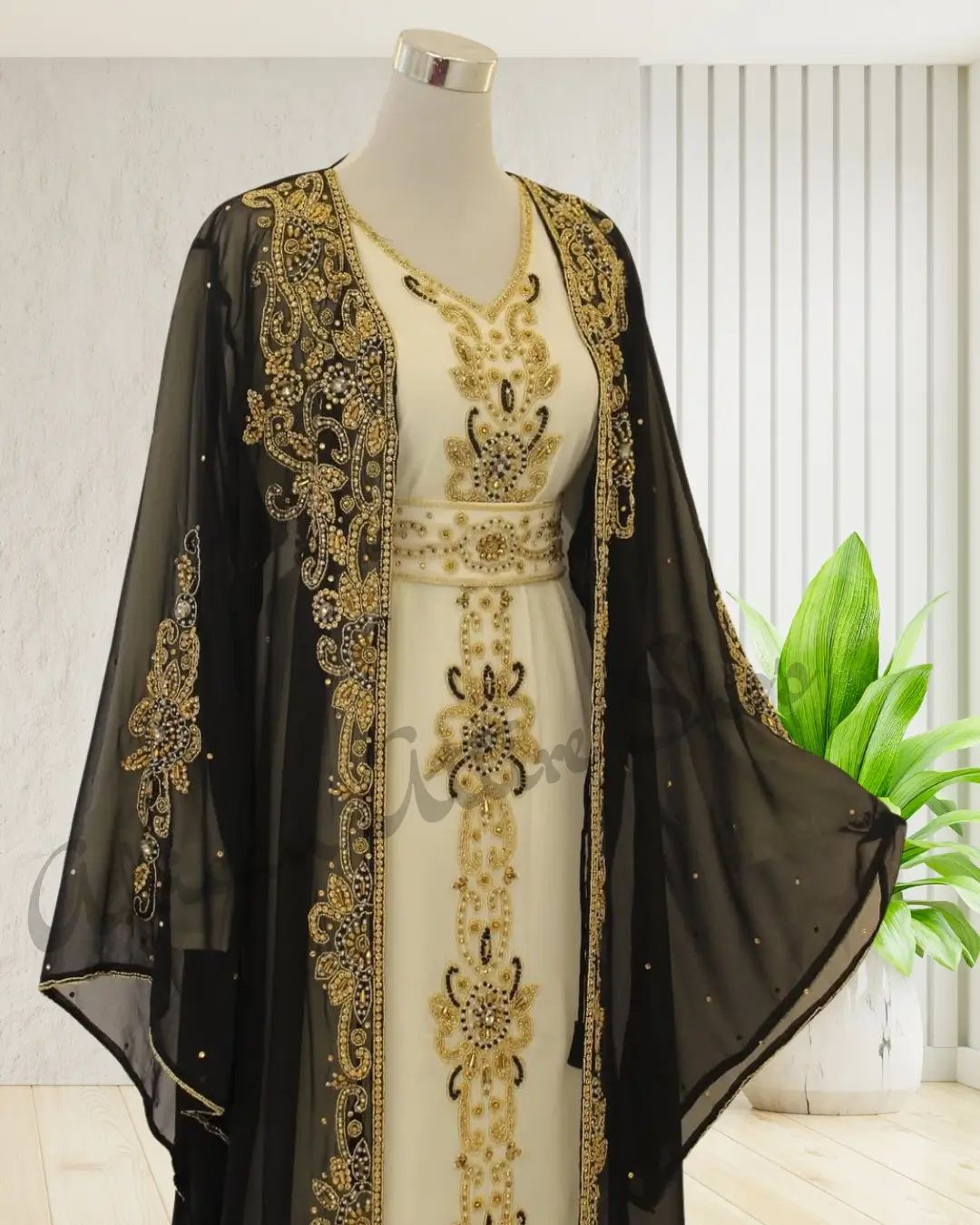 Step into royalty with this Moroccan Kaftan, a masterpiece of fine craftsmanship and elegance. The intricate gold hand embroidery and shimmering embellishments add a touch of opulence to this traditional yet modern design. The open-front cape enhances its regal appeal, while the golden belt cinches the waist for a flattering fit. Crafted from premium georgette, it offers a lightweight and flowing silhouette, making it perfect for weddings, parties, and cultural celebrations.