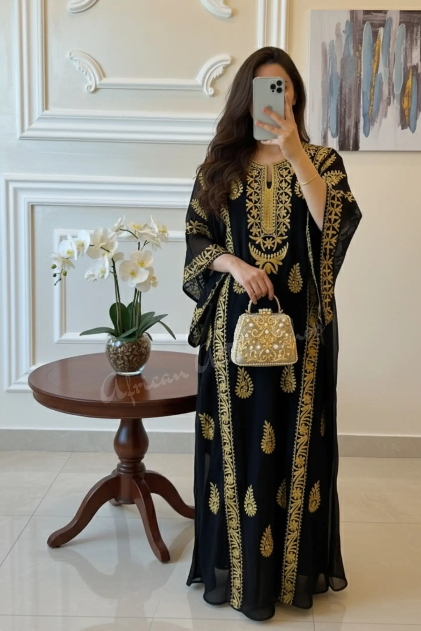 Step into timeless luxury with this Black Aari Embroidered Qatari Gown Kaftan, beautifully handcrafted using intricate golden threadwork. The detailed neckline, sleeve borders, and scattered leaf motifs create a stunning Arabic-inspired design that radiates elegance.