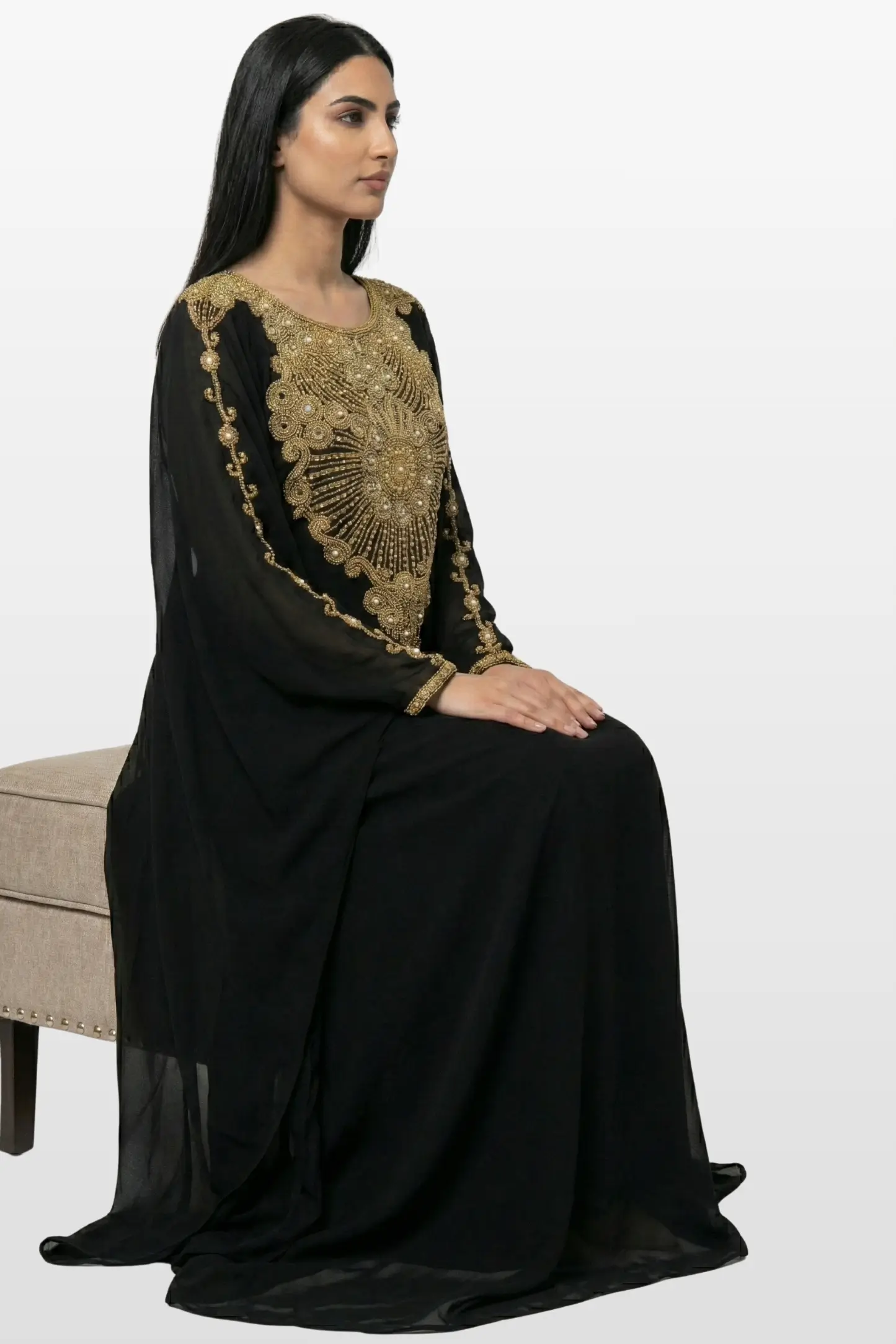 Add this luxurious black kaftan to your collection for a truly unforgettable look.