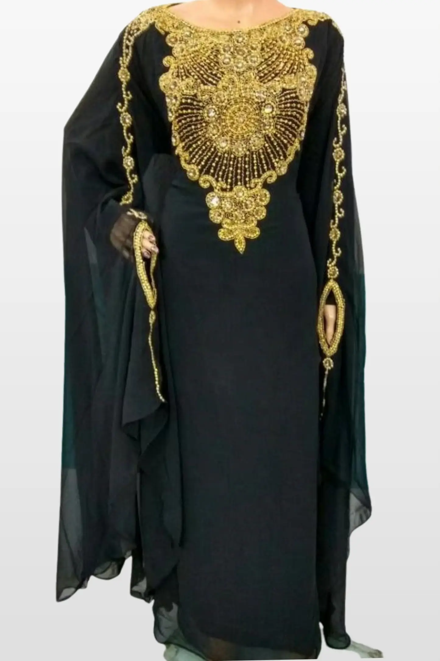 Indulge in timeless elegance with this Black Farasha Gold Embellished Moroccan Kaftan, a statement piece crafted for women who appreciate luxury, modesty, and refined design. Made from premium lightweight chiffon, this kaftan features exquisite hand-embellished gold embroidery concentrated at the neckline, forming a radiant, jewel-like pattern that reflects traditional Moroccan artistry.