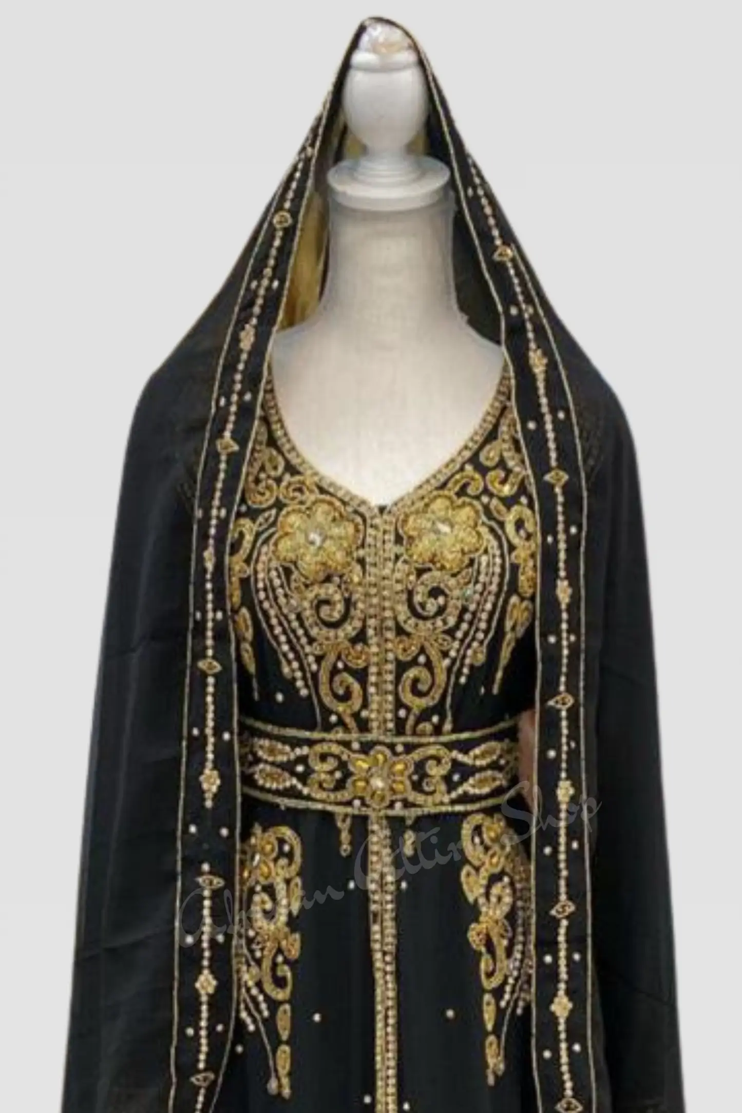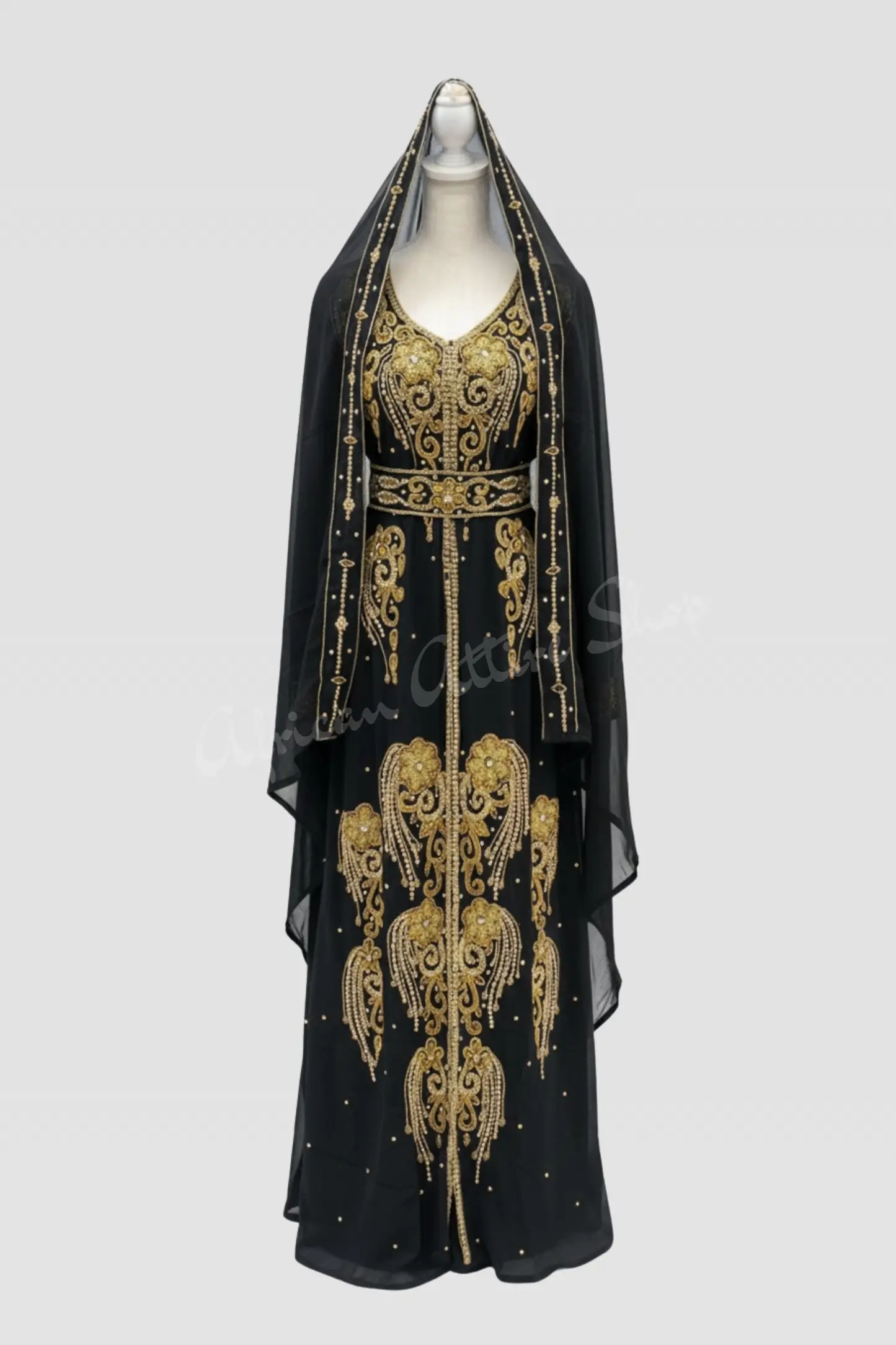 Step into timeless elegance with our Black Kaftan Dress, a masterpiece of luxury and craftsmanship. This kaftan is made from premium black velvet and adorned with gold hand embroidery and beaded embellishments that shimmer beautifully under any light.