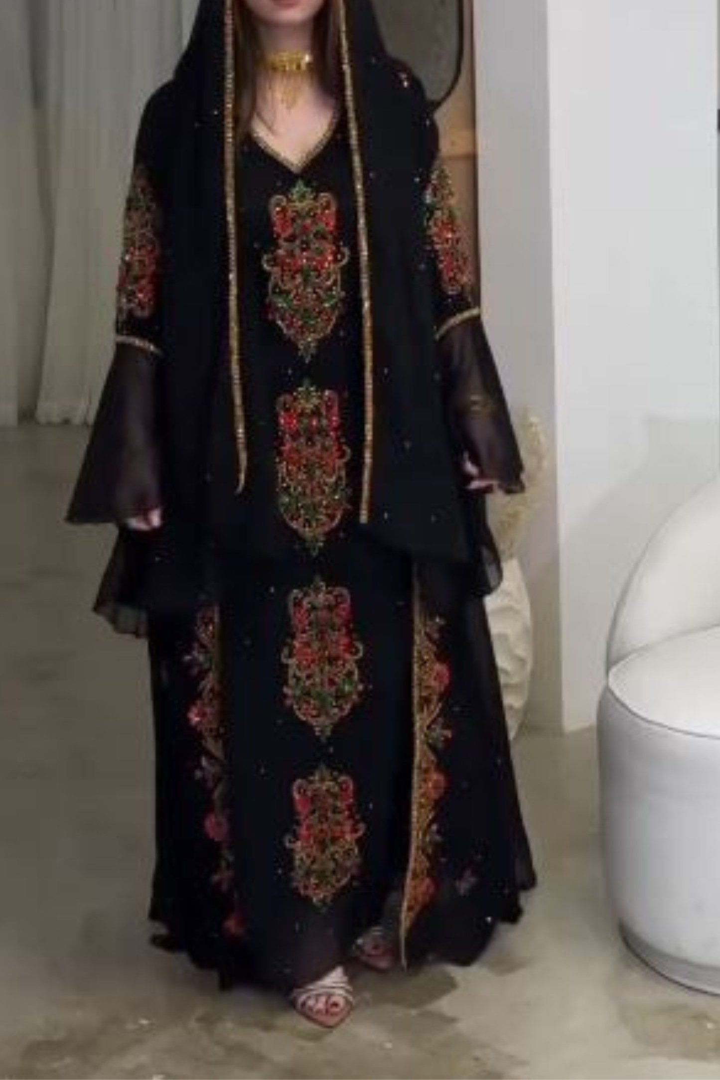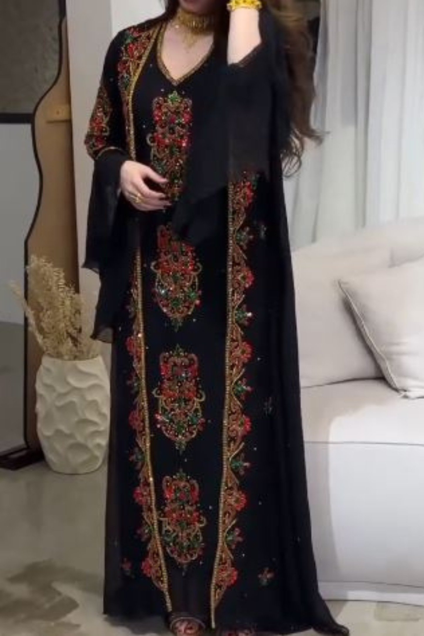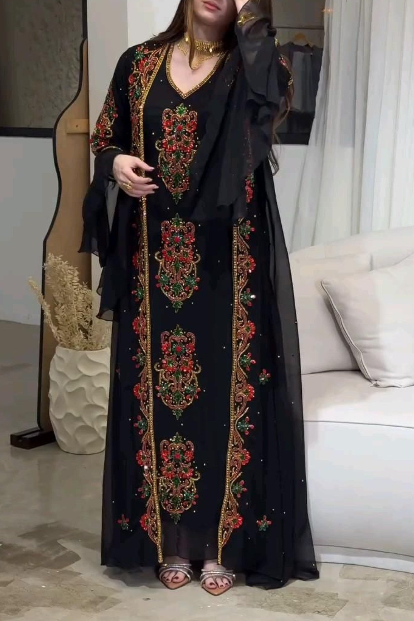 Make a bold statement with this Black Gold Floral Embroidered Moroccan Kaftan, designed for women who appreciate luxury, modesty, and timeless elegance. Crafted from premium georgette fabric, this kaftan features intricate hand embroidery in gold, accented with rich red and green floral motifs that add depth and royal charm.