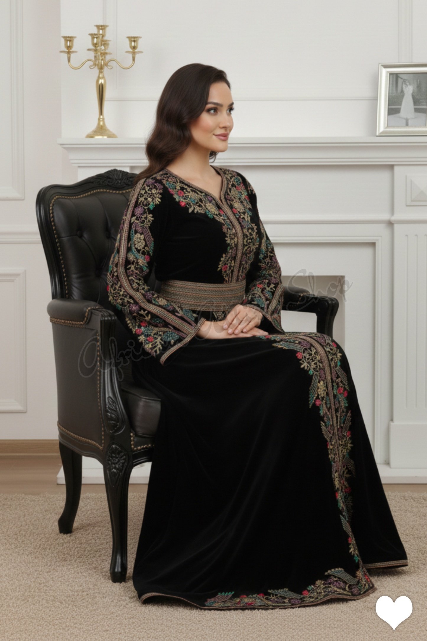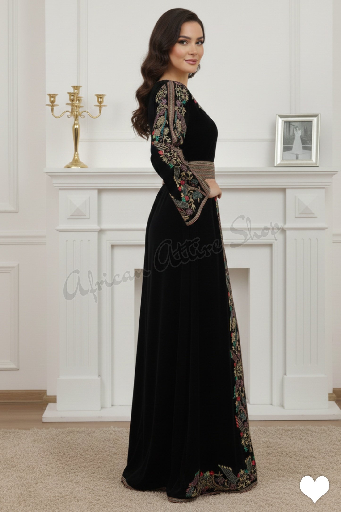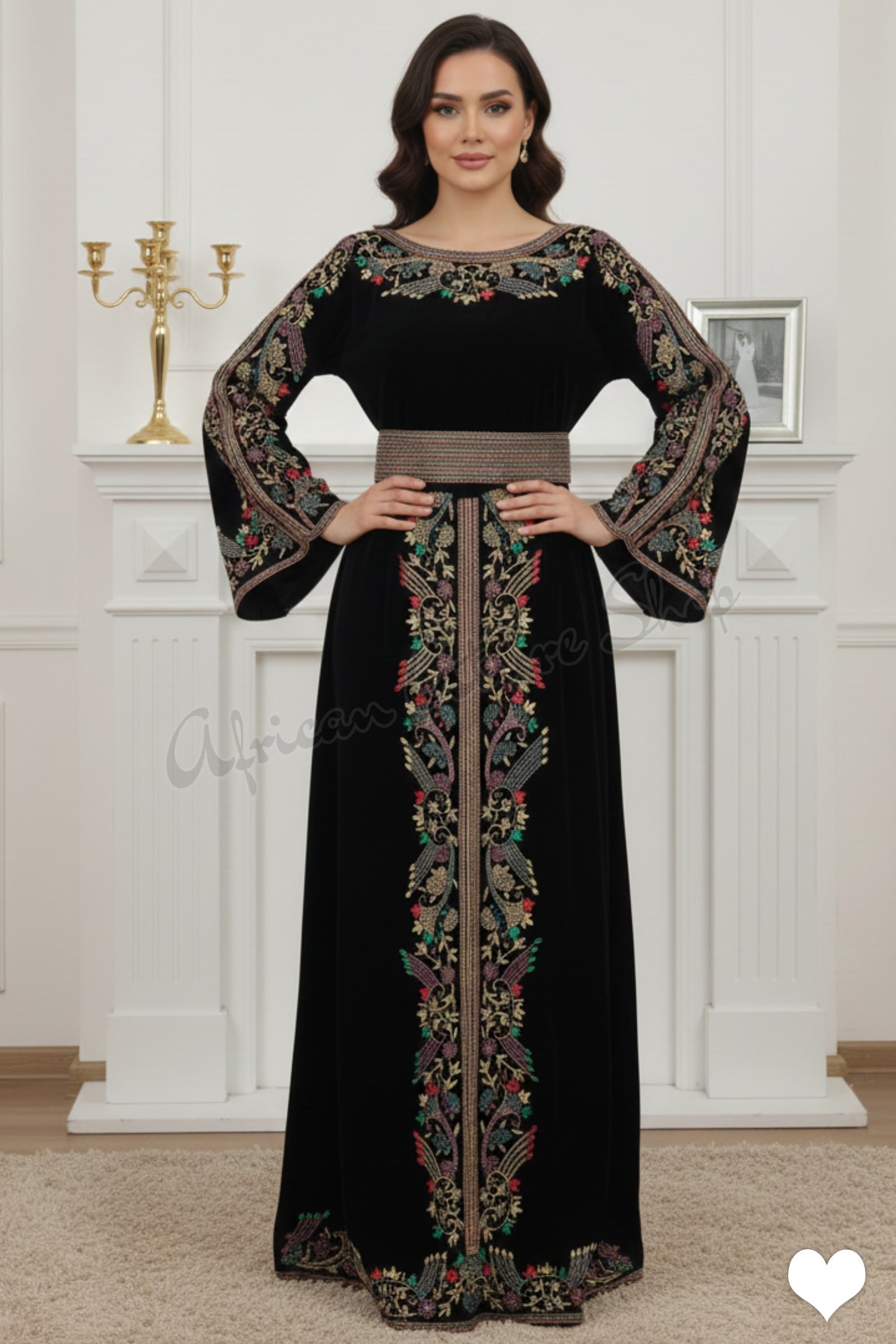 Available in standard and custom sizes, every order is carefully packaged to ensure safe worldwide delivery. Choose this black velvet embroidered thobe to elevate your wardrobe with timeless elegance, rich detailing, and luxurious charm.