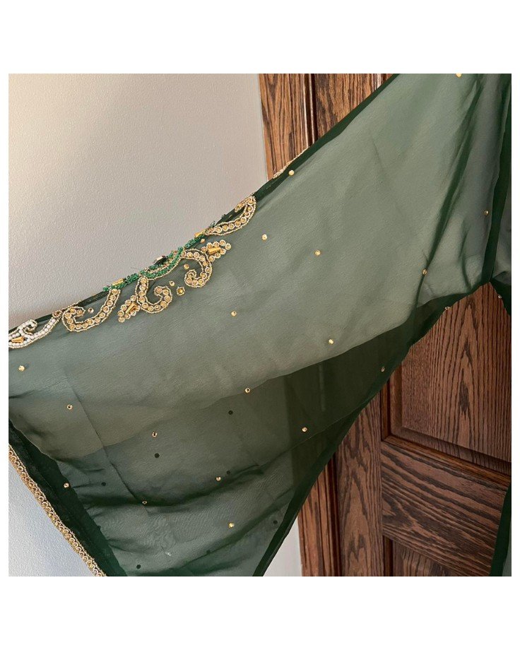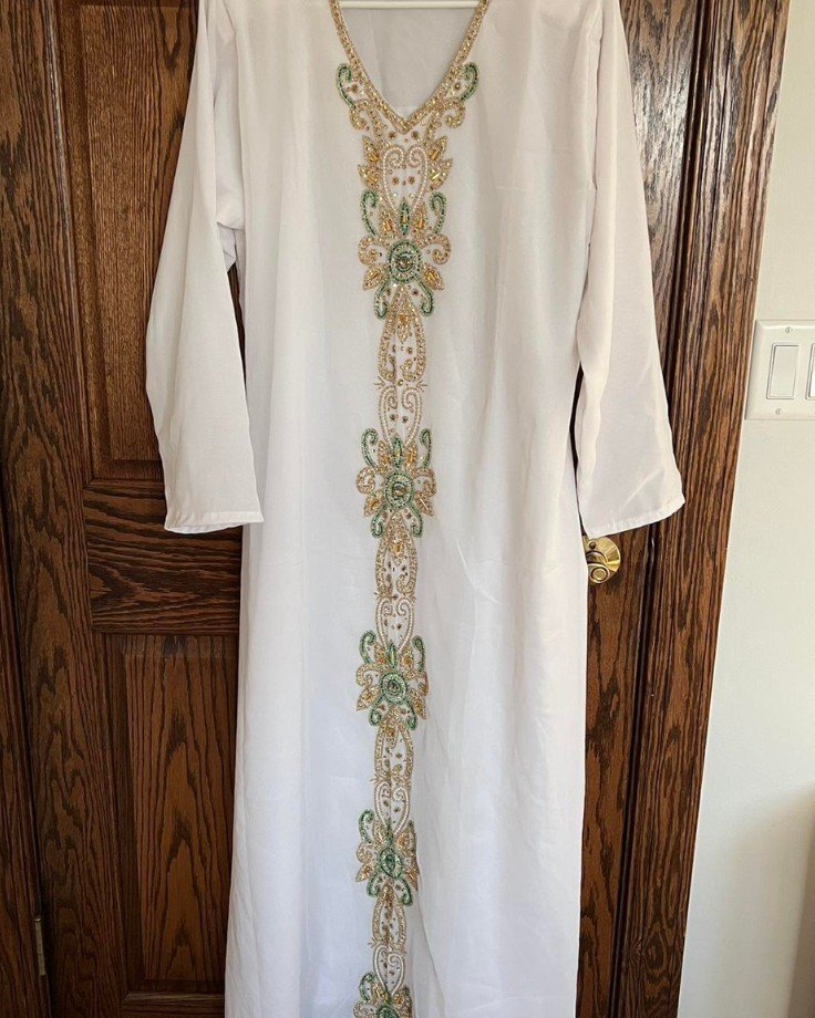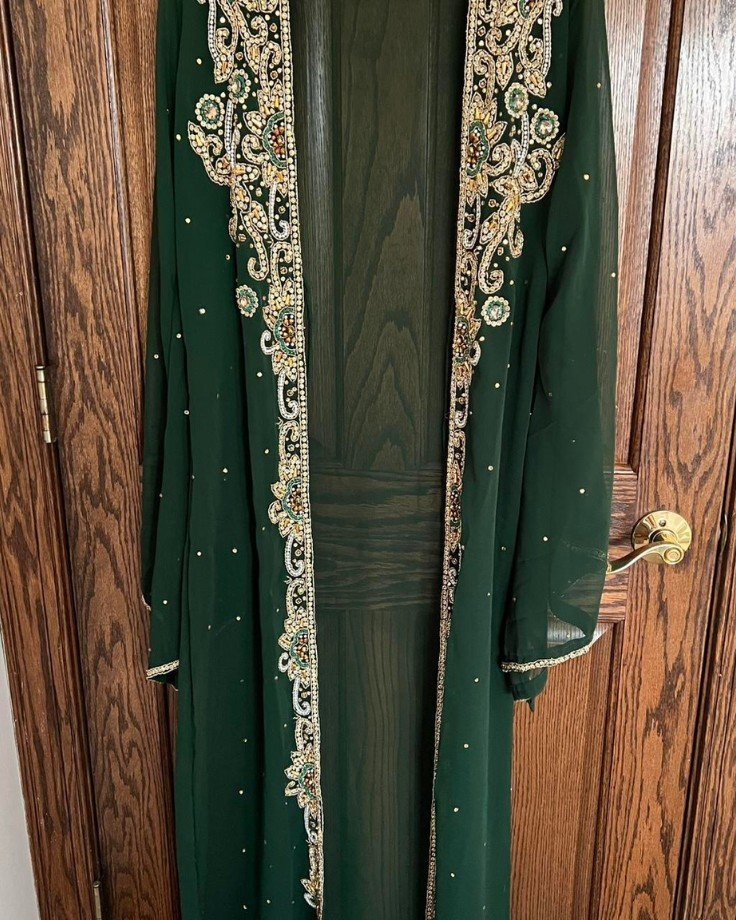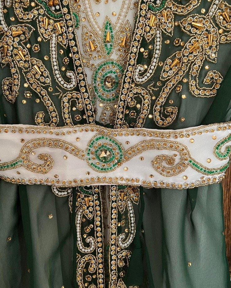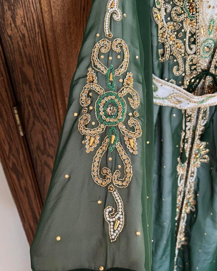 Elevate your occasion wear with this elegant Dark Green Moroccan Kaftan, a masterpiece of intricate craftsmanship. The detailed gold and multicolor hand embroidery adds regal charm, while the white embroidered belt enhances your waistline for a flattering silhouette. Designed with flowy bell sleeves and a graceful full-length cut, this kaftan is ideal for bridesmaids, wedding guests, or traditional celebrations. Make a royal entrance in timeless Moroccan fashion.