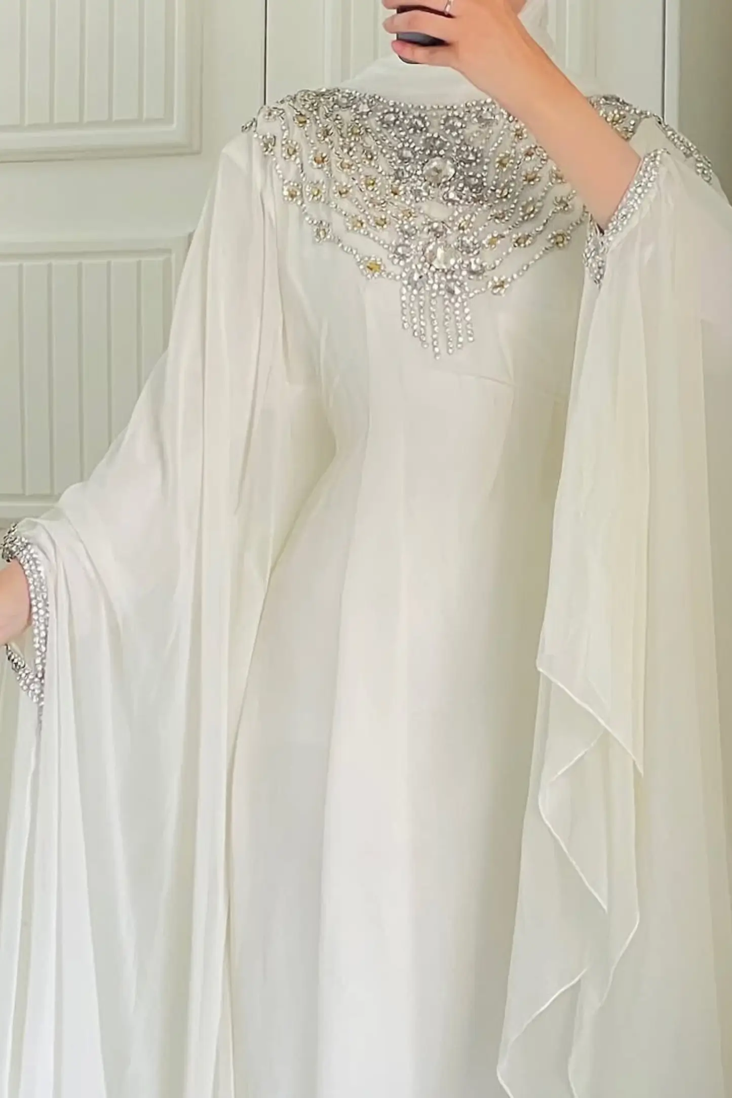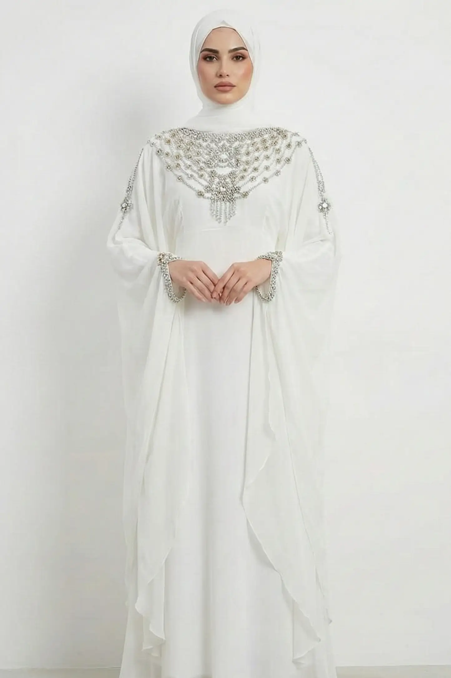 Ideal for nikah ceremonies, bridal wear, engagement parties, Eid celebrations, receptions, and formal evenings, this kaftan blends modern luxury with classic modest fashion. The pure white shade symbolizes elegance and purity, making it a perfect alternative to traditional bridal gowns.