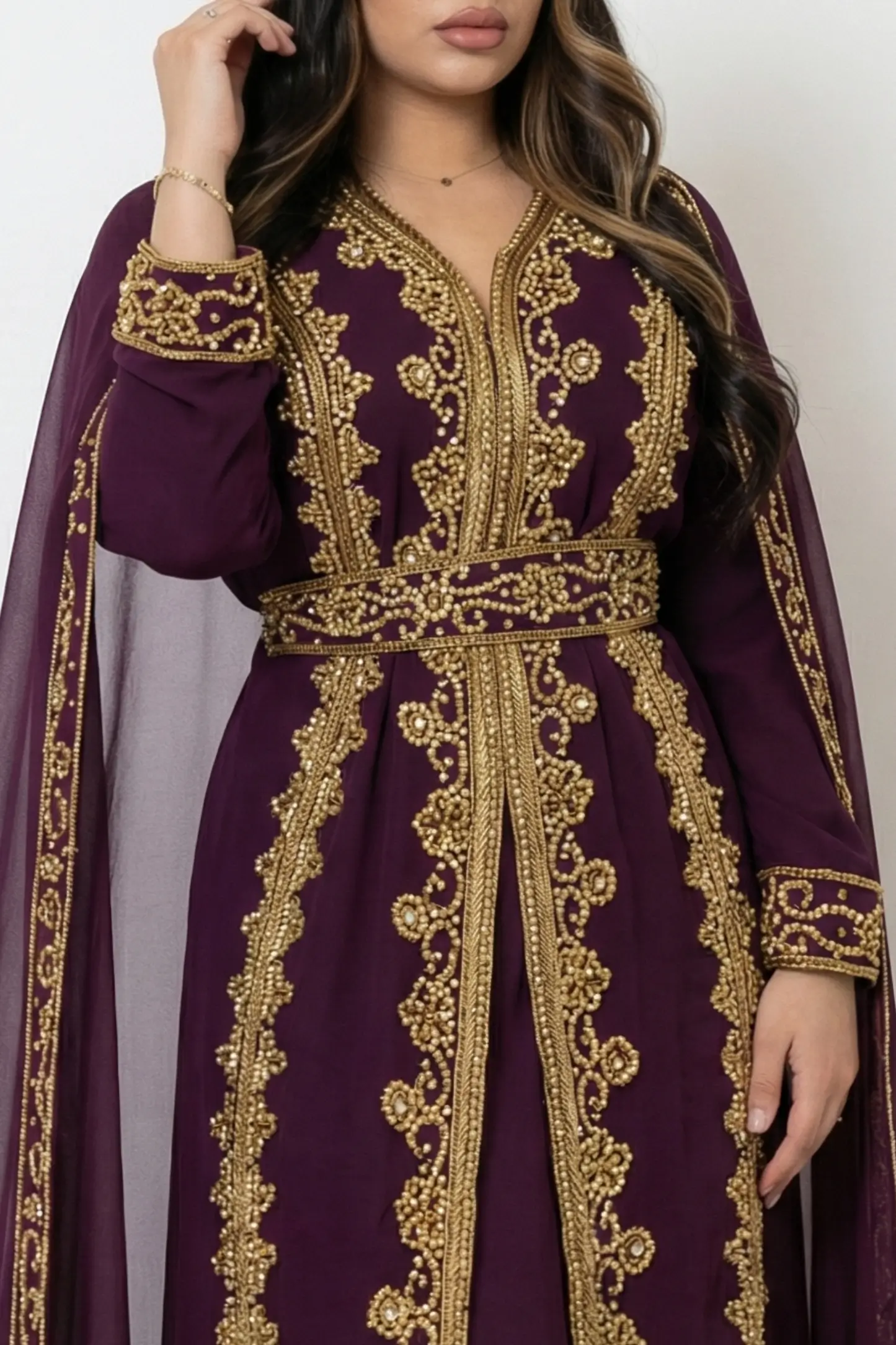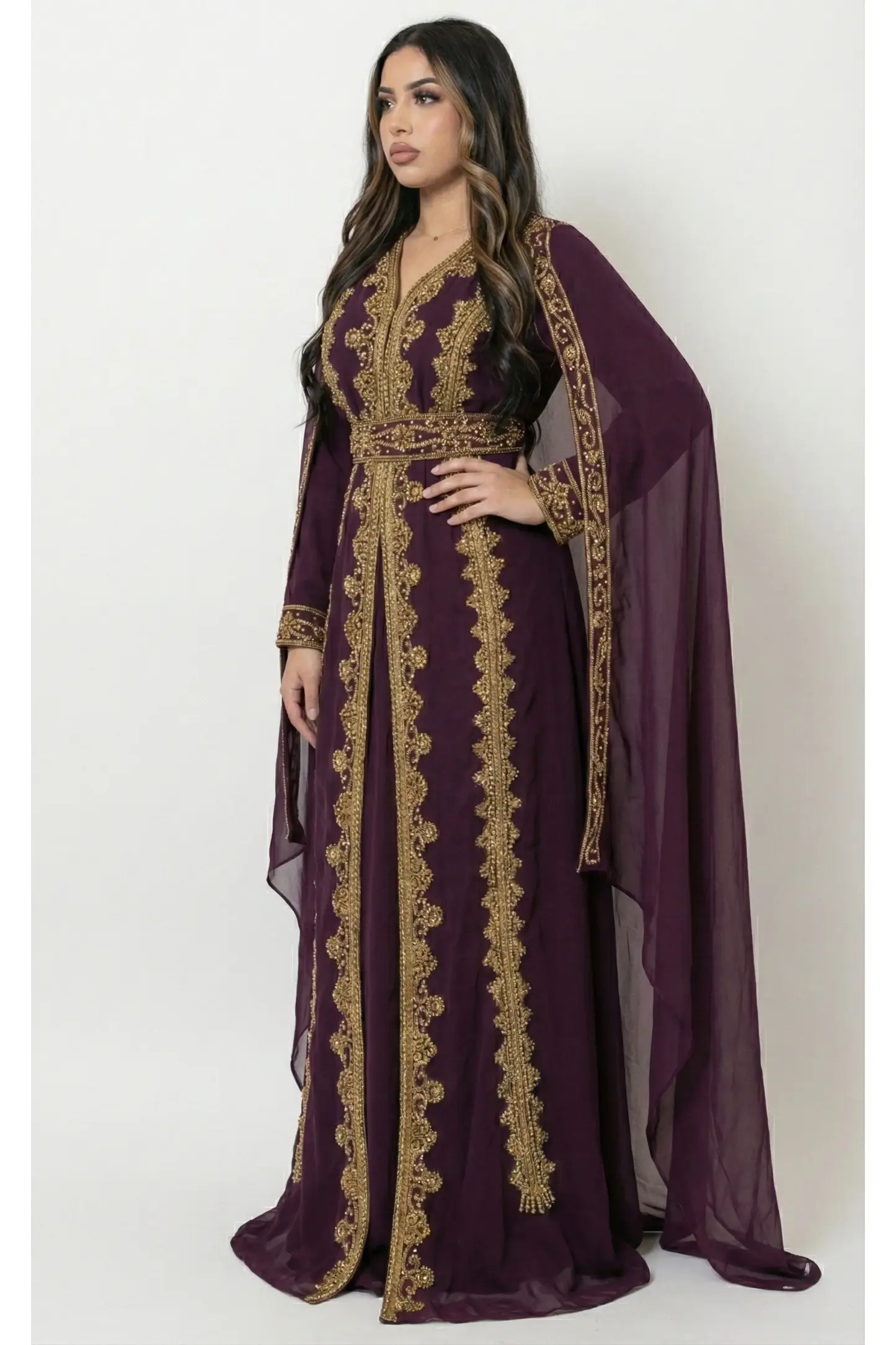 Elevate your occasion wardrobe with this Wine Gold Embellished Moroccan Kaftan, designed for women who appreciate timeless elegance and luxury craftsmanship. The deep plum hue adds richness and sophistication, while the intricate gold hand embroidery highlights the neckline, front panel, sleeves, belt, and hem.