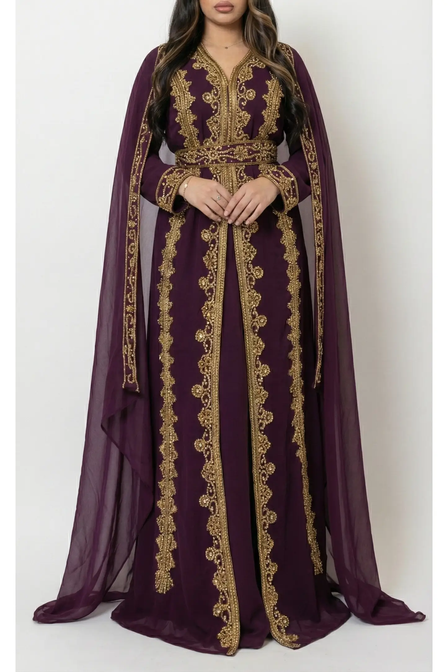 Crafted from premium lightweight georgette, this kaftan offers a graceful flow and breathable comfort, making it ideal for long celebrations. The structured embroidered waist belt enhances the silhouette without compromising modesty, while the sheer cape-style sleeves add a dramatic, regal touch.