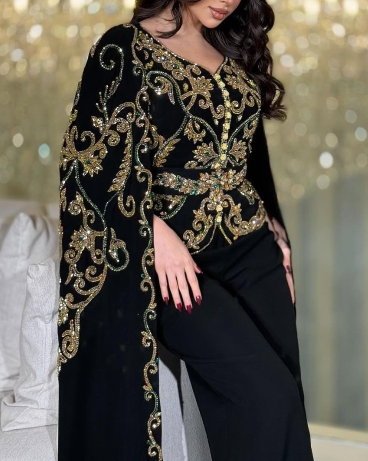 Turn heads with this Black Moroccan Kaftan Jacket Set, crafted for modern queens. The jacket features intricate gold embroidery, long cape sleeves, and a flattering belted waist. Paired with matching wide-leg black trousers, this ensemble blends elegance with comfort. Perfect for weddings, Eid, or glamorous parties, this outfit adds a touch of royal charm to your wardrobe.