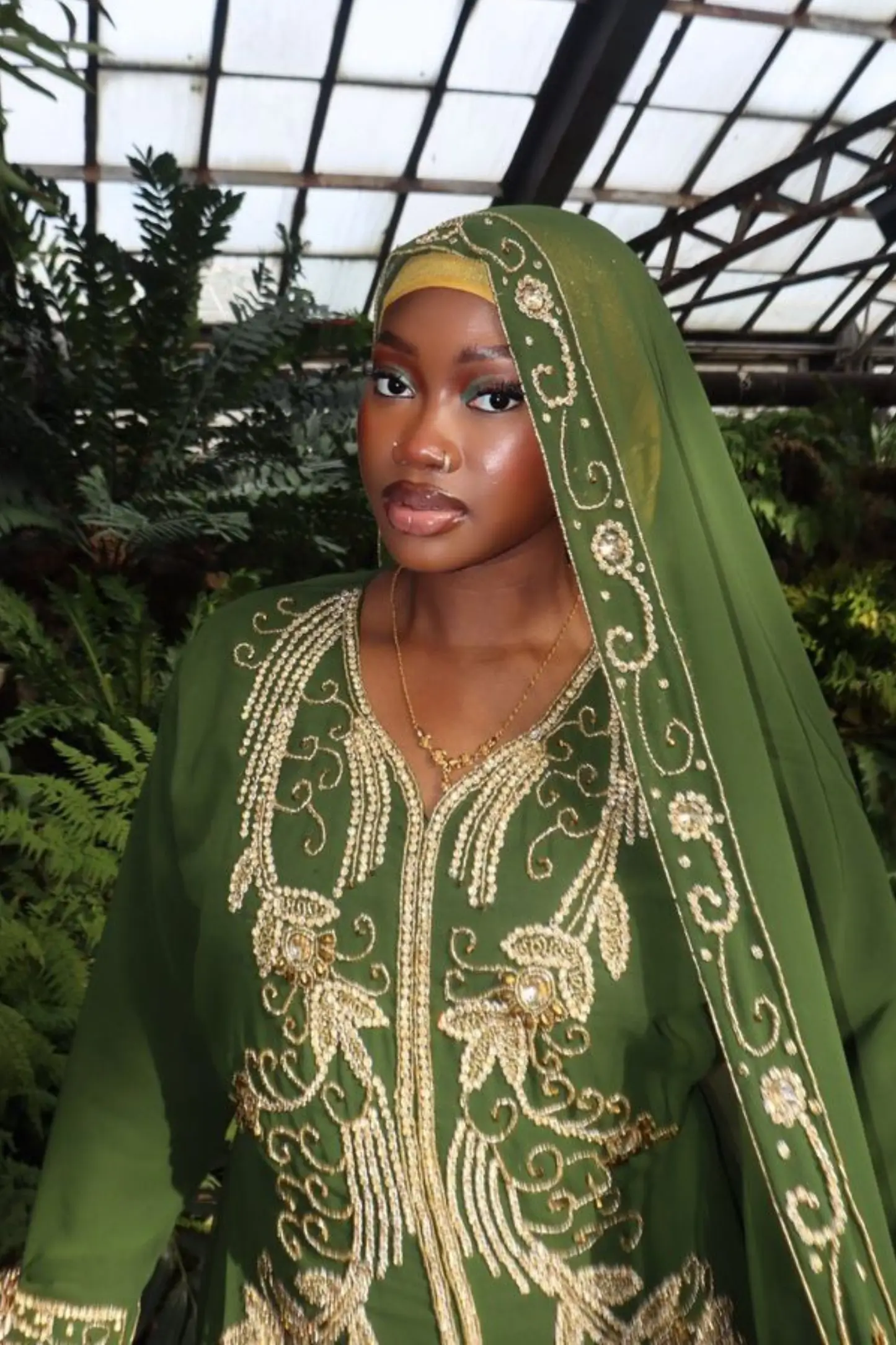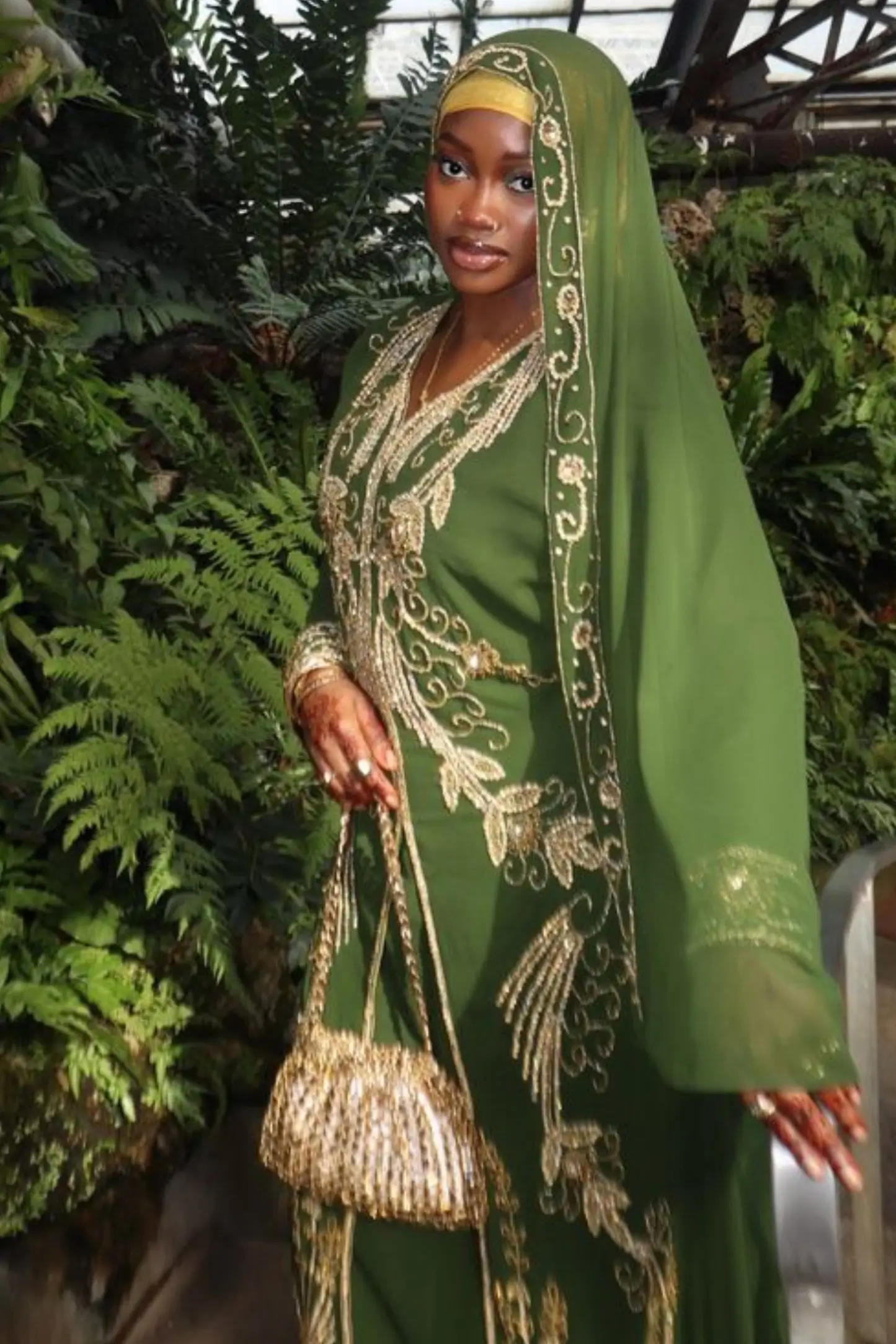 Embrace regal elegance with this Forest Green Gold Embroidered Moroccan Kaftan, a masterpiece of modest luxury inspired by African heritage and Dubai couture. Crafted from premium flowing fabric, this kaftan features intricate gold hand embroidery cascading gracefully along the front, sleeves, and cuffs, creating a striking contrast against the deep green base.