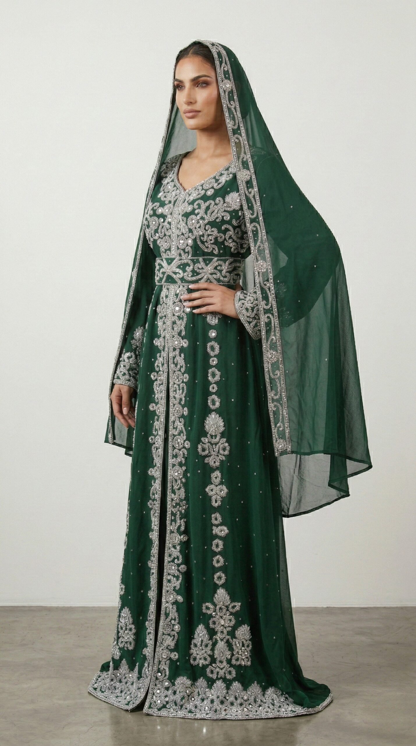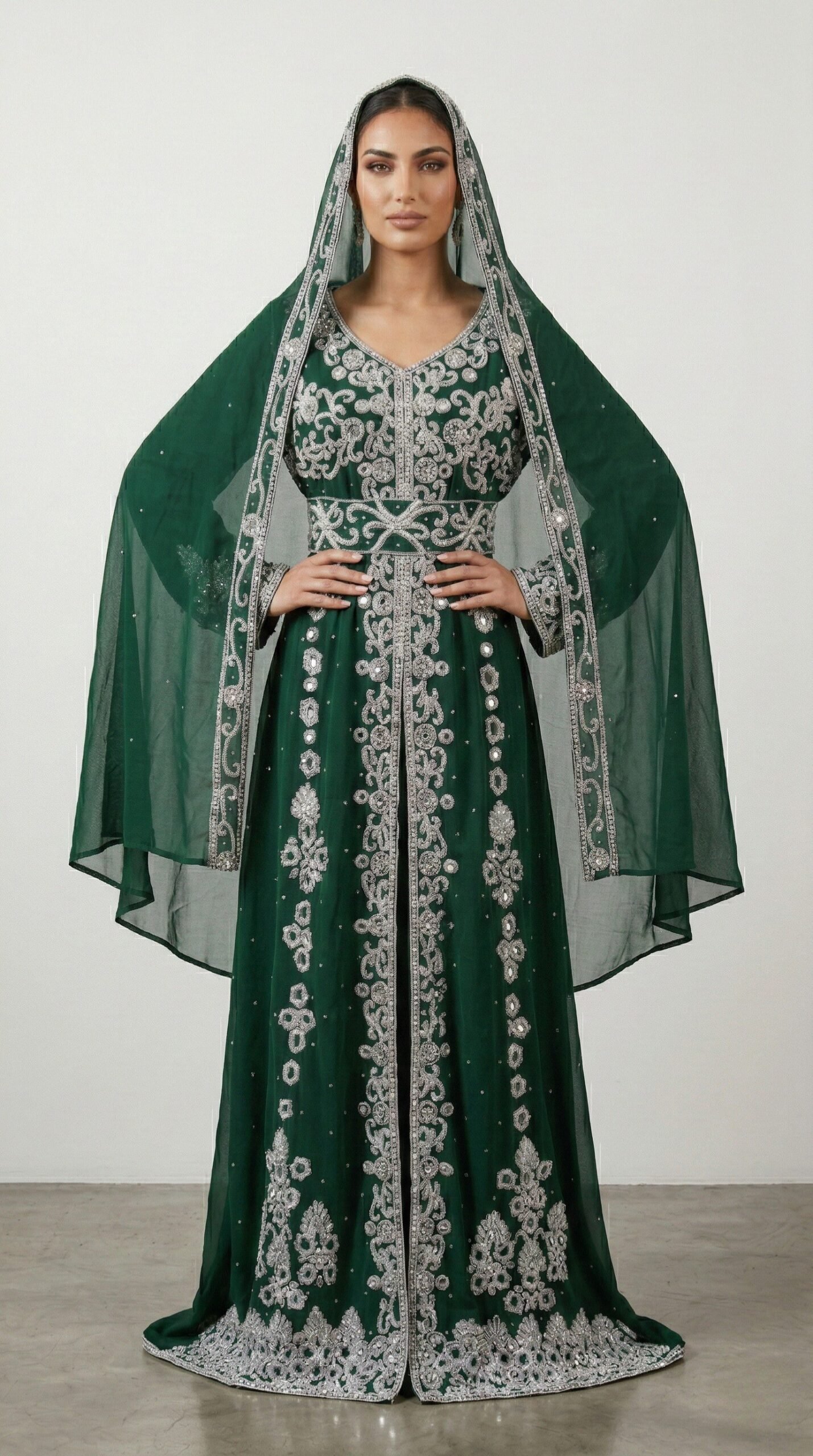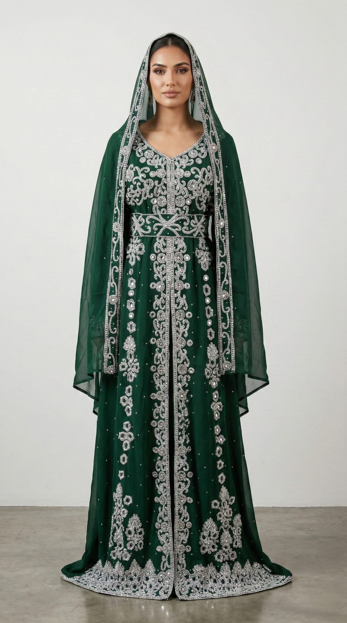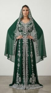 Make a regal statement with this green Moroccan kaftan adorned with intricate silver embroidery. Designed with traditional craftsmanship and modern elegance, this luxury kaftan features detailed hand embellishments along the neckline, waist, and full-length front panel. The structured waist enhances the silhouette while maintaining modest sophistication. Paired with a matching sheer embroidered veil, it creates a complete royal look ideal for weddings, Nikkah ceremonies, Eid celebrations, and evening events. The deep emerald tone symbolizes richness and elegance, beautifully contrasted by shimmering silver embroidery. Crafted from premium flowing fabric, this kaftan offers comfort, movement, and timeles