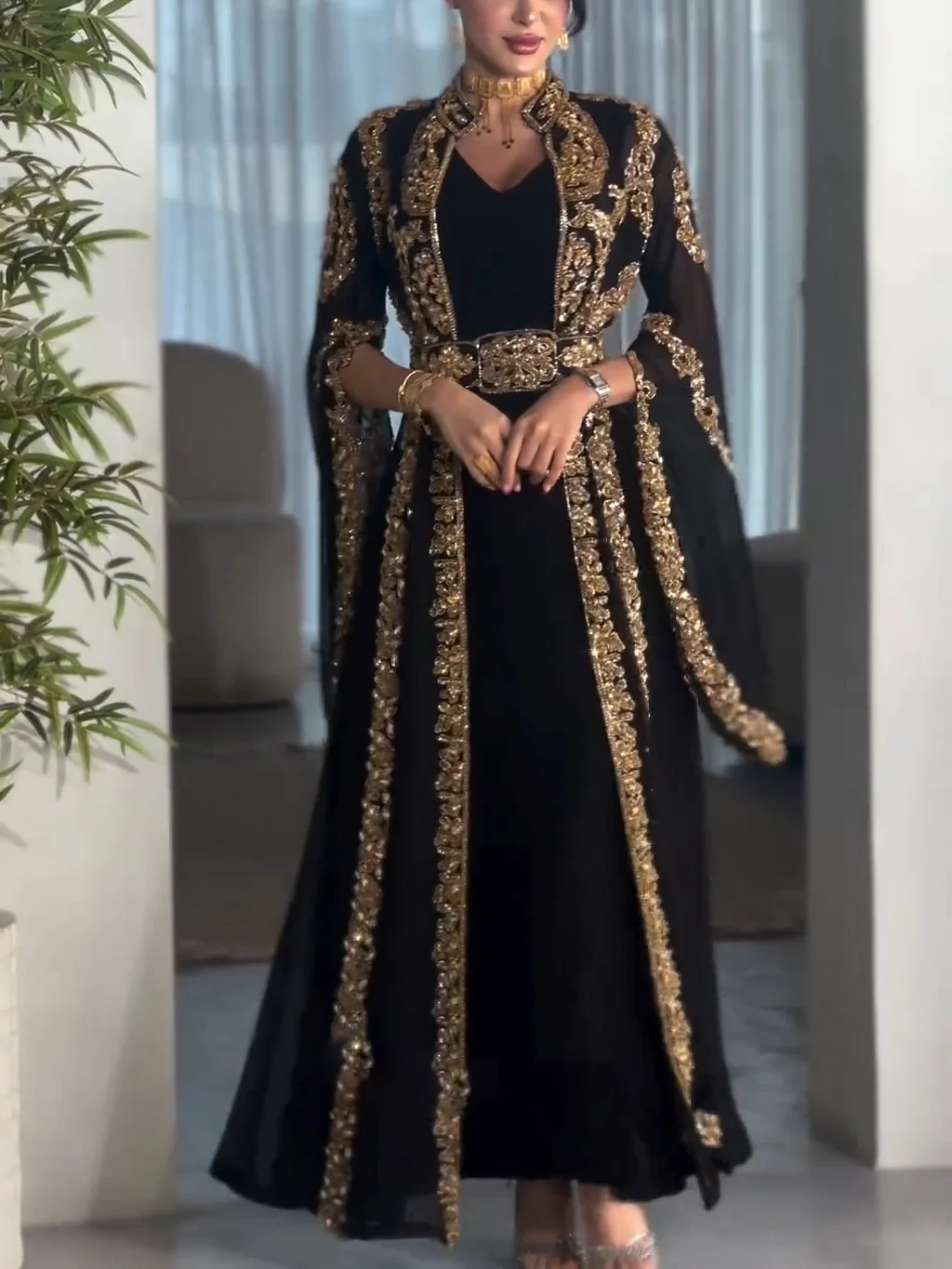 Step into royal elegance with our hand-embellished black and gold Moroccan-style kaftan. Crafted for queens, this luxurious floor-length piece features opulent gold embroidery, sequins, and hand-placed embellishments from shoulder to hem.