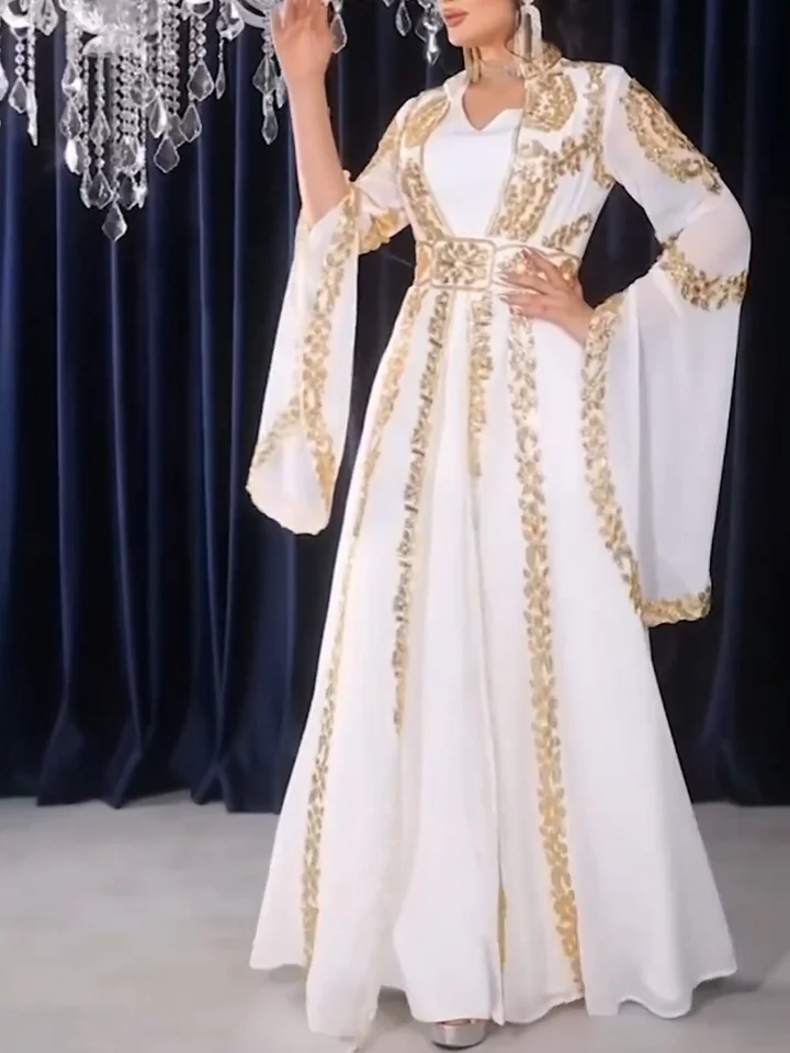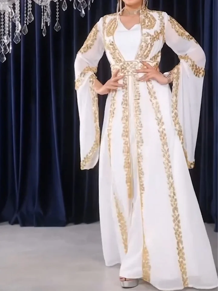 The kaftan includes a dramatic open-front overlay, gracefully flowing sleeves, and a broad matching belt to cinch the waist and flatter your silhouette. Whether you’re dressing for a wedding reception, Eid celebration, henna night, or high-end gala, this piece delivers timeless sophistication.