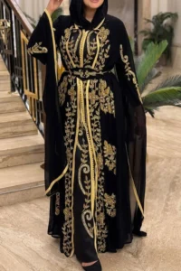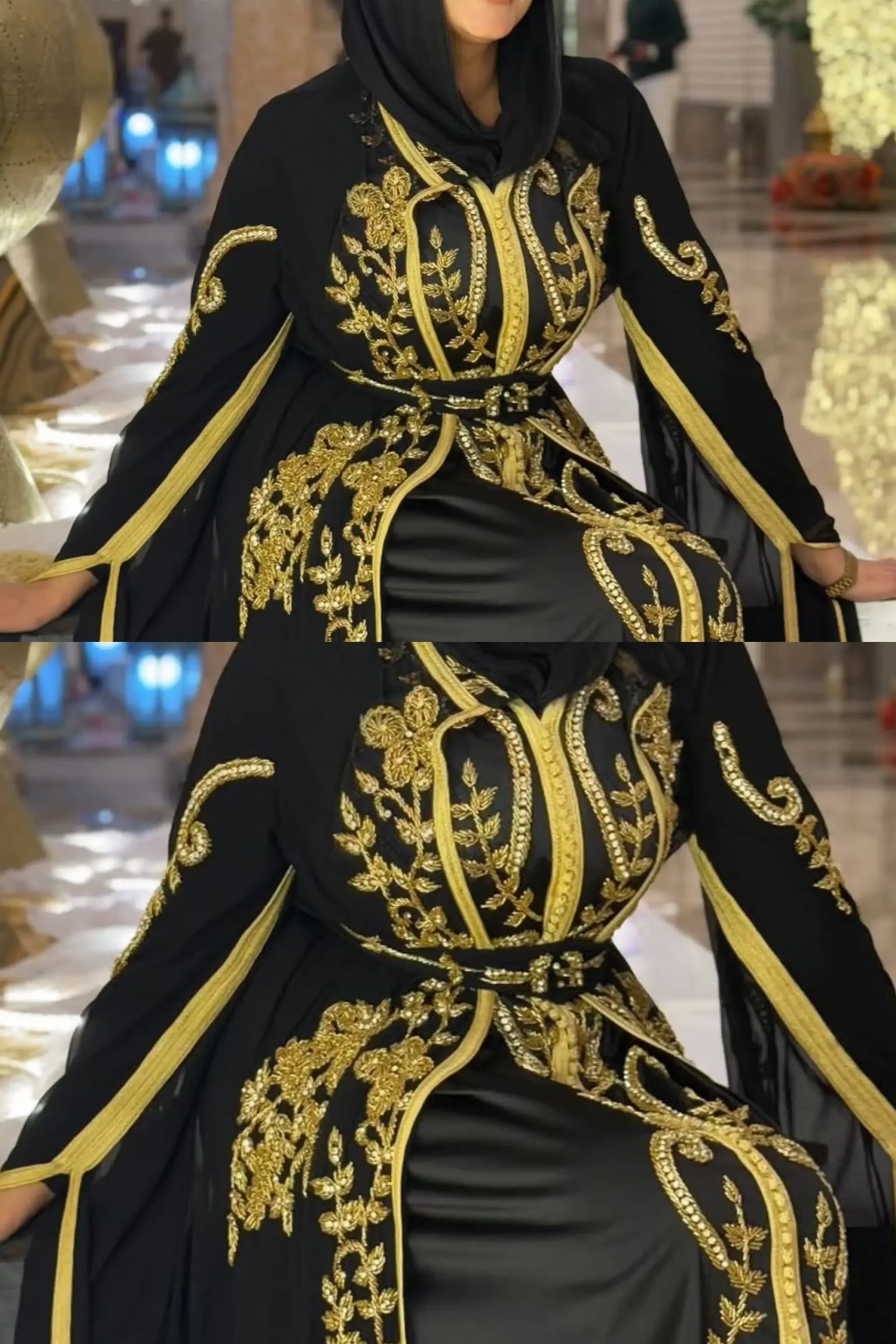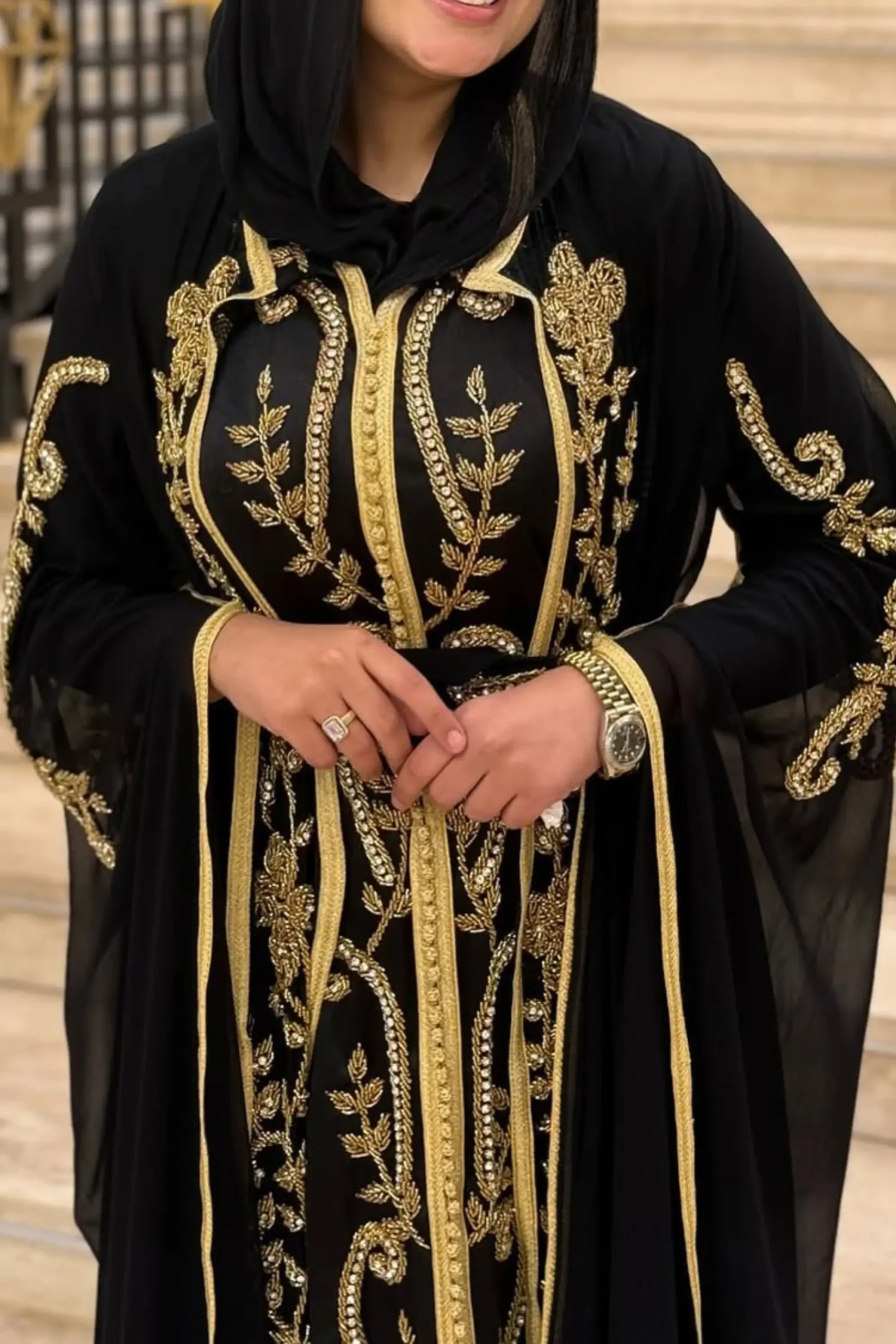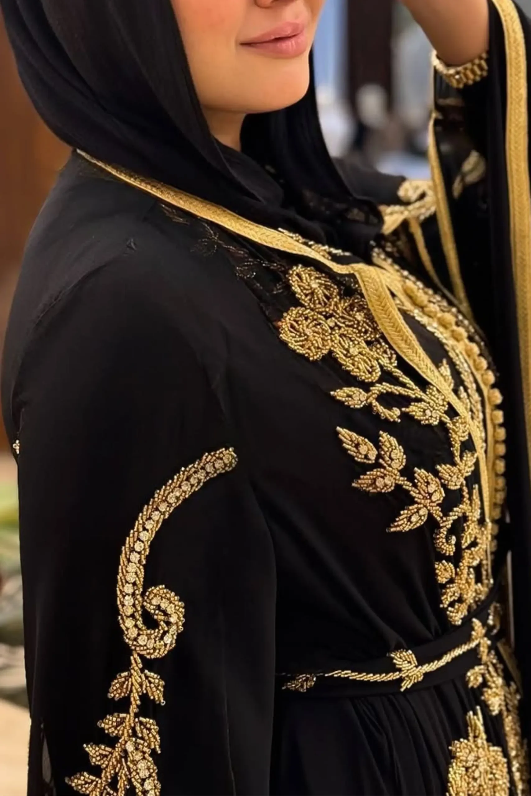 Step into luxury with this stunning Black Moroccan Kaftan Farasha Abaya, featuring intricate gold embroidery and handcrafted embellishments. The flowing butterfly sleeves and ornate floral patterns create a royal and graceful silhouette, while the matching embroidered belt cinches the waist for a flattering fit. Made from high-quality georgette with a soft inner lining, this kaftan abaya ensures comfort without compromising on elegance. Ideal for weddings, Eid celebrations, parties, and formal gatherings, this exquisite piece is a must-have for those who appreciate timeless beauty.