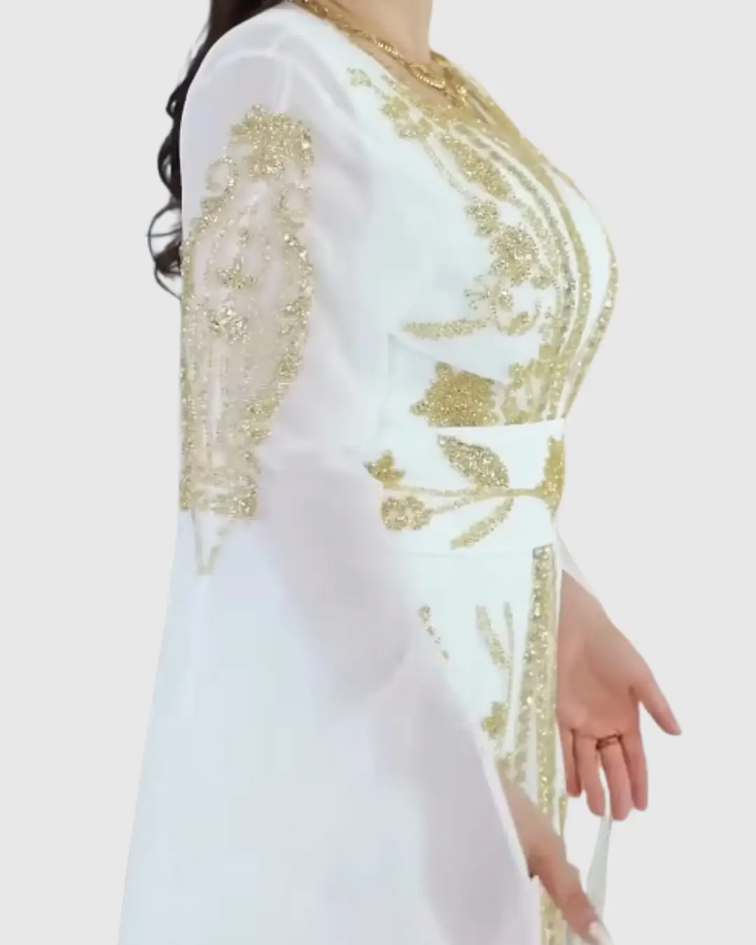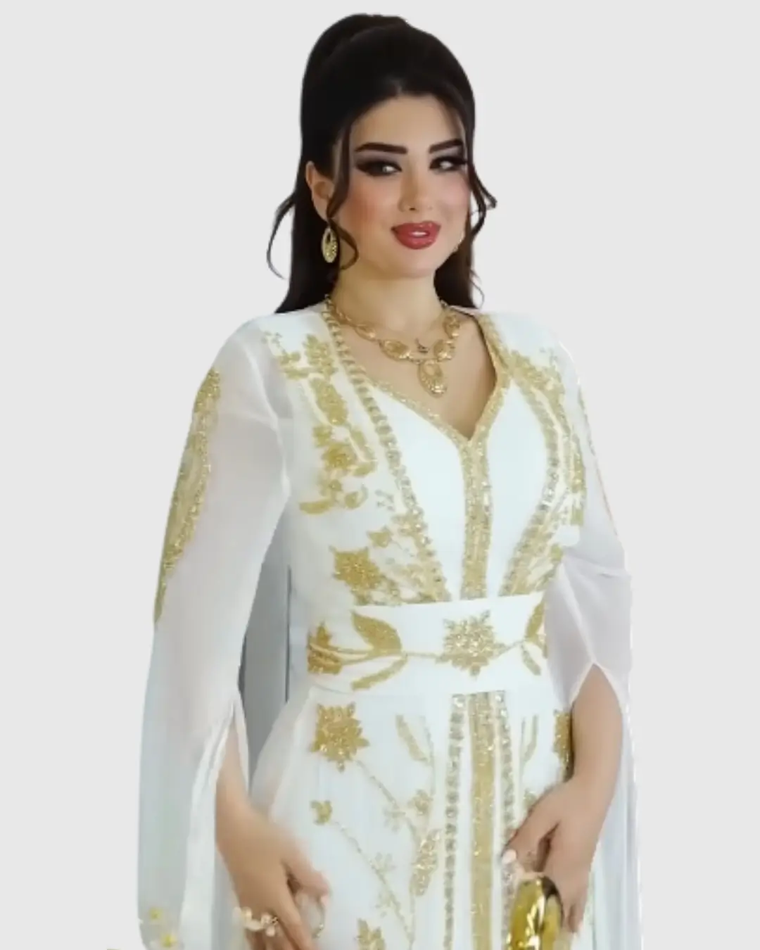 | Product Name | Moroccan White & Gold Hand-Embroidered Kaftan Dress | |
