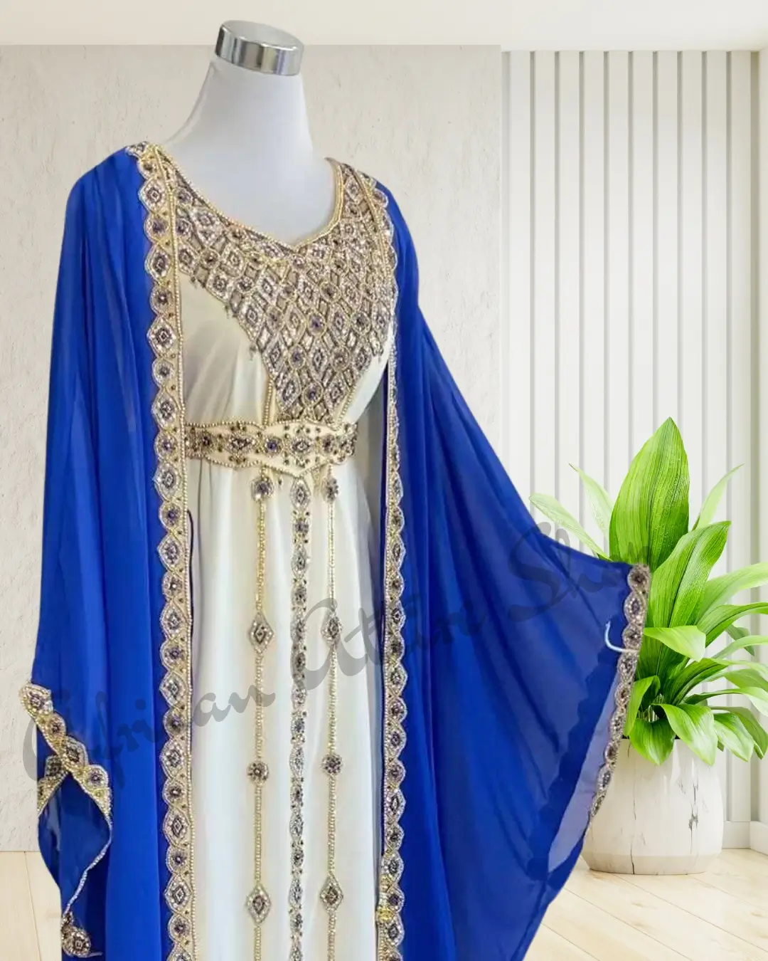 Drape yourself in luxury with this Royal Blue & White Moroccan Kaftan, an exquisite piece featuring handcrafted gold embroidery. Designed with a flowing cape, intricate beadwork, and a gold-accented bodice, this kaftan embodies timeless Moroccan elegance. The lightweight chiffon fabric ensures breathability and comfort, making it perfect for grand celebrations like weddings, Eid, and formal events. The matching embroidered belt adds the perfect finishing touch, enhancing the royal aesthetic.
