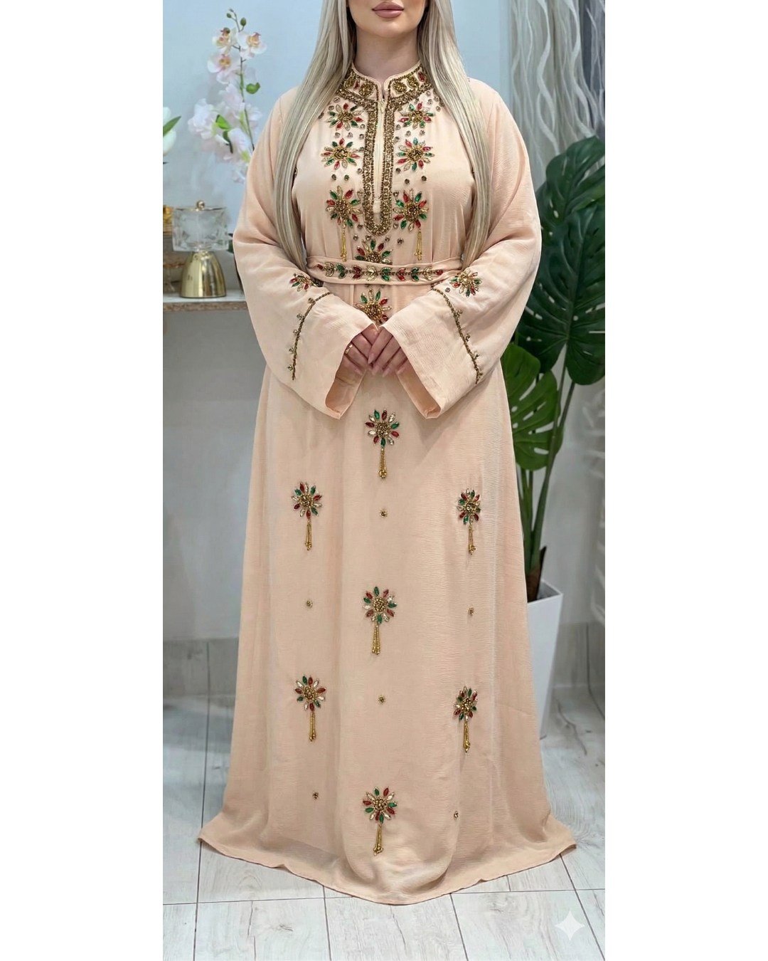 Step into elegance with this beige Moroccan caftan featuring stunning multicolor stone embroidery. Designed for modern modest fashion lovers, this kaftan showcases intricate hand embellishments with red and green stones, beautifully arranged across the neckline and body. The adjustable belt enhances the silhouette while maintaining comfort and modest coverage. Crafted from premium lightweight fabric, it offers graceful movement and all-day wearability. Ideal for weddings, Eid celebrations, parties, and formal occasions, this caftan blends traditional Moroccan craftsmanship with contemporary luxury. The neutral beige tone paired with vibrant embroidery creates a sophisticated yet eye-catching look, making it a standout addition to your wardrobe.