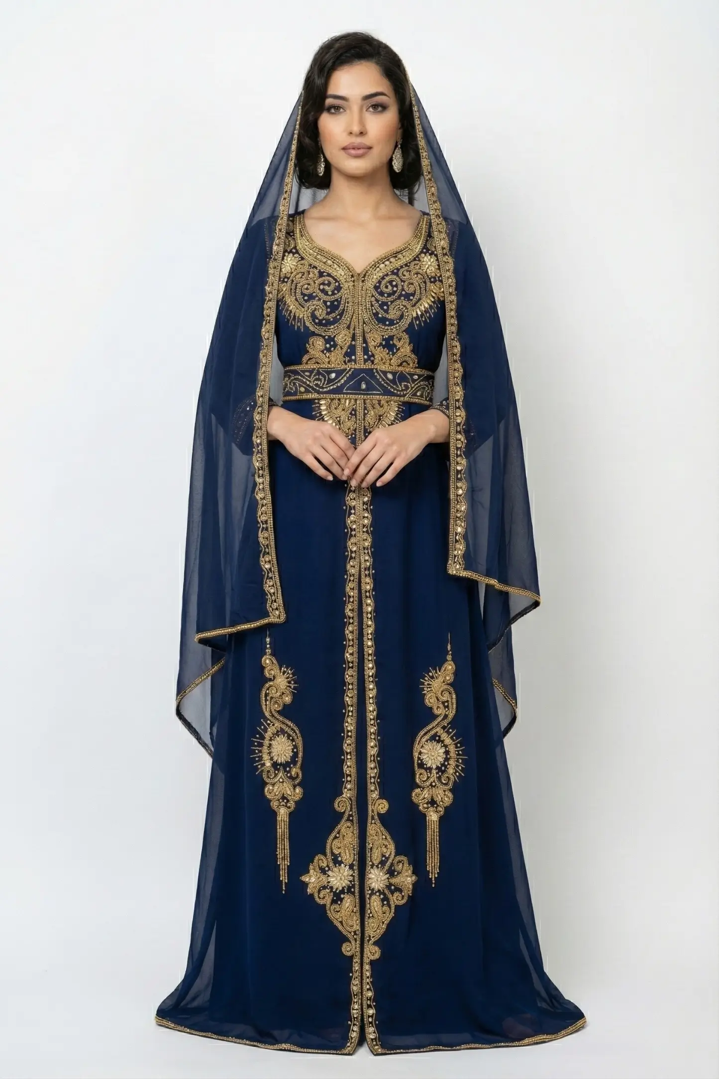 Step into refined elegance with this Navy Blue Gold Embroidered Moroccan Kaftan, a timeless design inspired by traditional Moroccan and Dubai couture. Crafted from premium lightweight georgette, this kaftan drapes beautifully, offering both comfort and luxury in every movement.