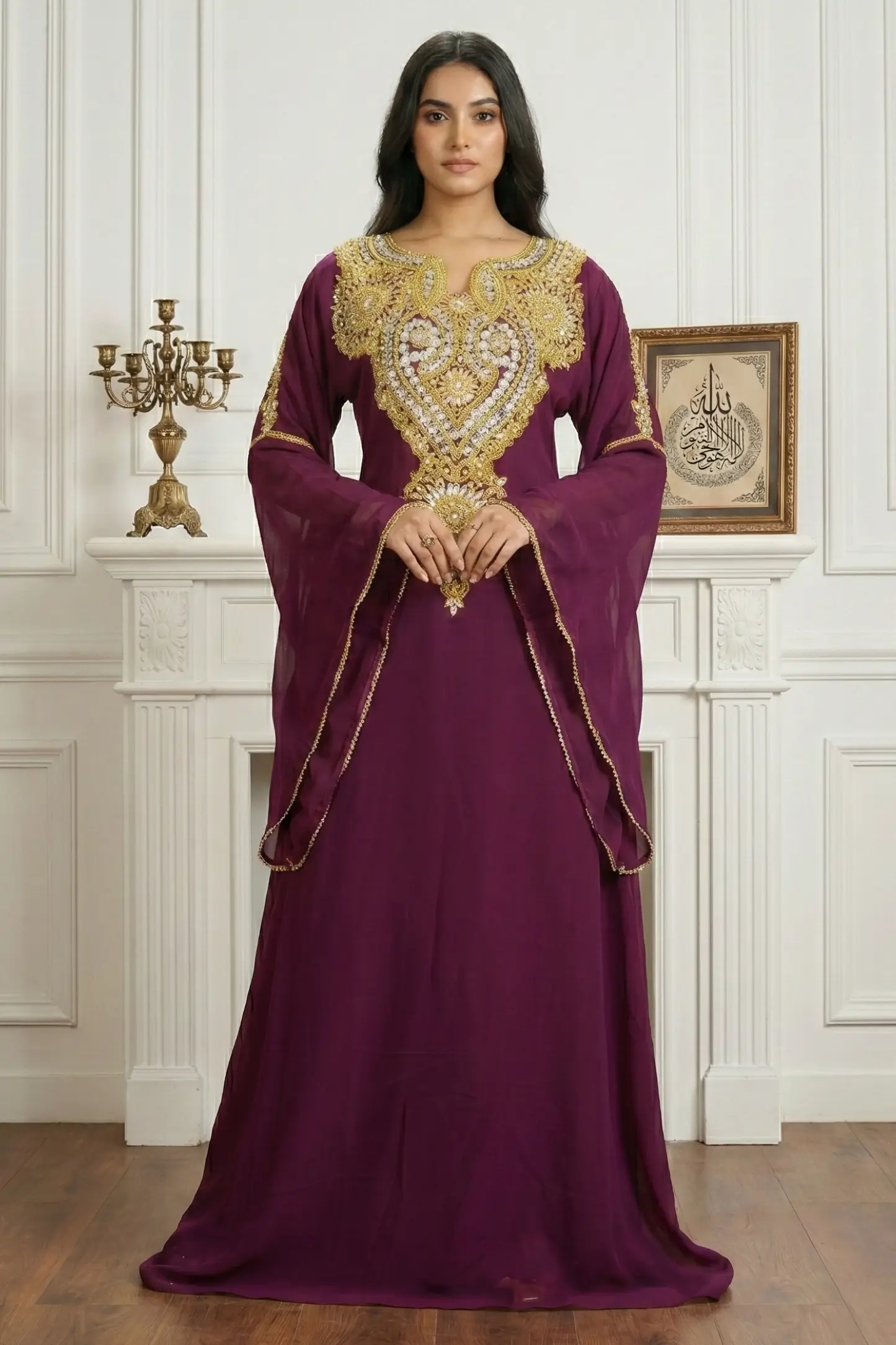 Elevate your occasion wear with this Moroccan kaftan dress, beautifully crafted with intricate gold embroidery. The richly embellished neckline and center panel showcase traditional Moroccan artistry, creating a regal and elegant appearance. Designed with flowing butterfly sleeves and a relaxed silhouette, this kaftan offers both comfort and sophistication. The premium fabric drapes effortlessly, making it perfect for weddings, Eid celebrations, Nikkah ceremonies, and formal evening events. Its deep purple tone paired with gold detailing exudes timeless luxury and modest charm. Whether styled as a statement evening kaftan or festive abaya dress, this piece is a must-have for women who appreciate refined craftsmanship and cultural elegance.