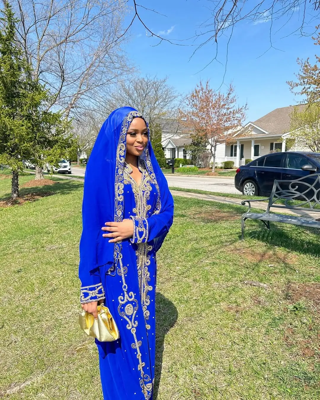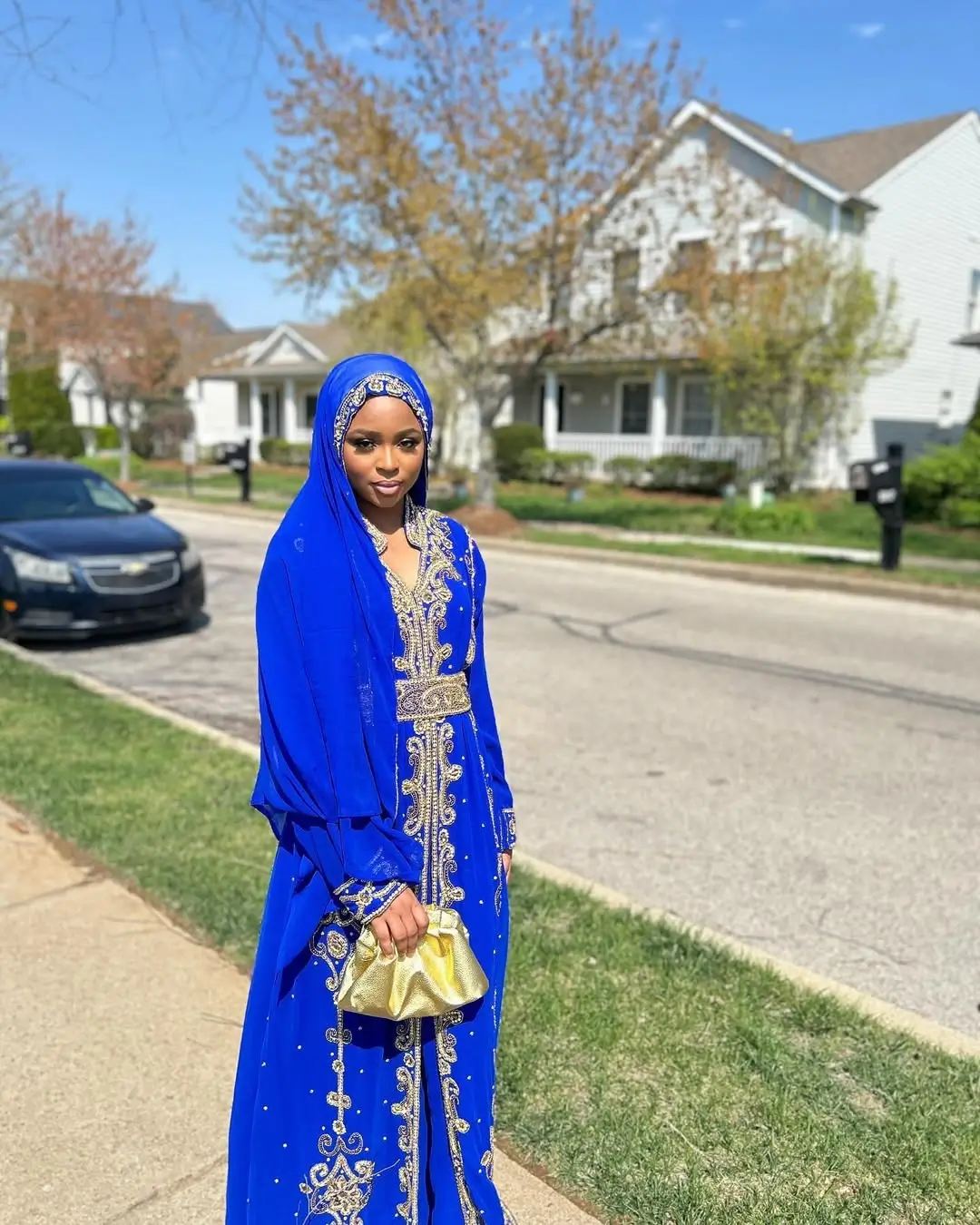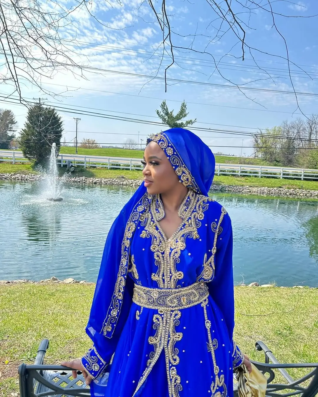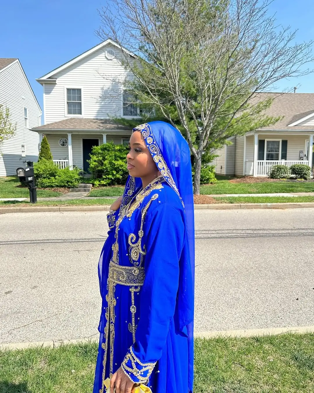 1 review for Royal Blue Moroccan Kaftan – Gold Embroidered Elegant Abaya with Matching Hijab | Hand Beaded Arabic Maxi Dress for Party Wear, Wedding Gown, Ramadan Gift & Special Occasions