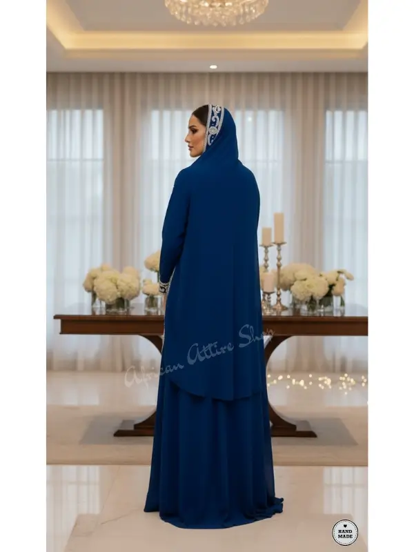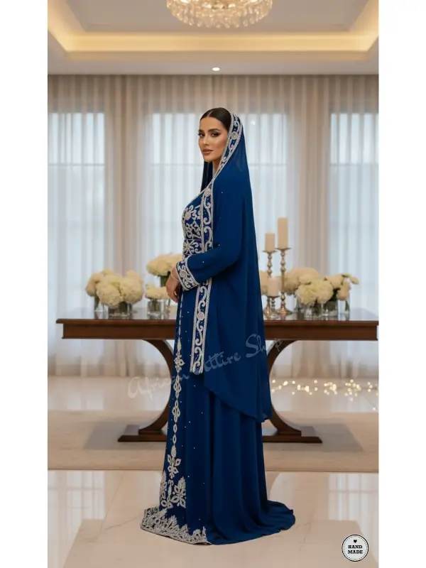 Step into timeless elegance with this Royal Blue Moroccan Wedding Kaftan Dress, a luxurious creation that blends tradition with sophistication. Expertly handcrafted with intricate silver embroidery, this gown reflects Moroccan artistry at its finest. The flowing silhouette, detailed cuffs, and matching embroidered belt add depth and grace to your bridal look. Made from high-quality georgette, it drapes beautifully and ensures comfort throughout your special day. Ideal for brides, engagement celebrations, or festive events, this kaftan symbolizes royalty, heritage, and modern beauty in one masterpiece.