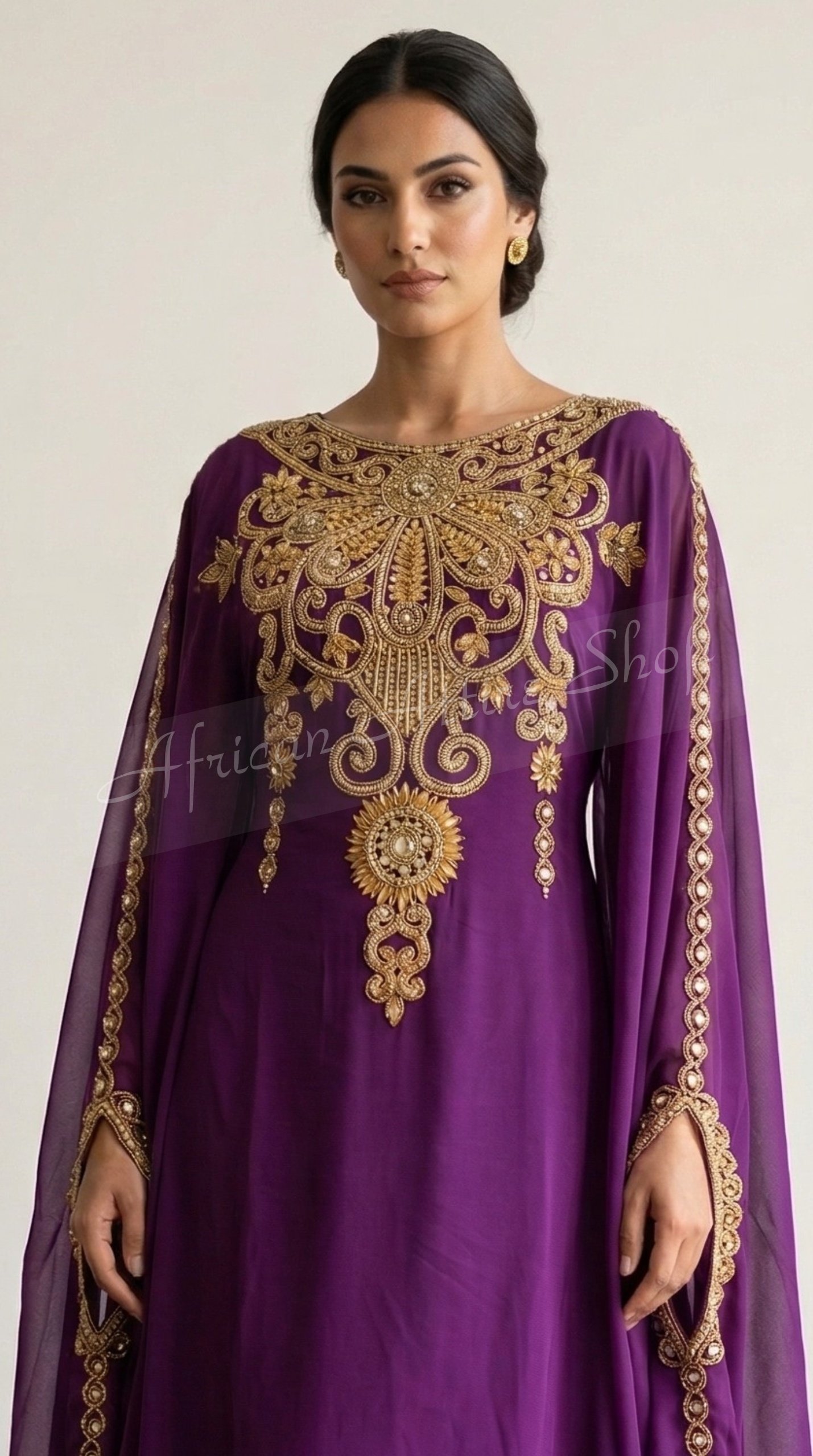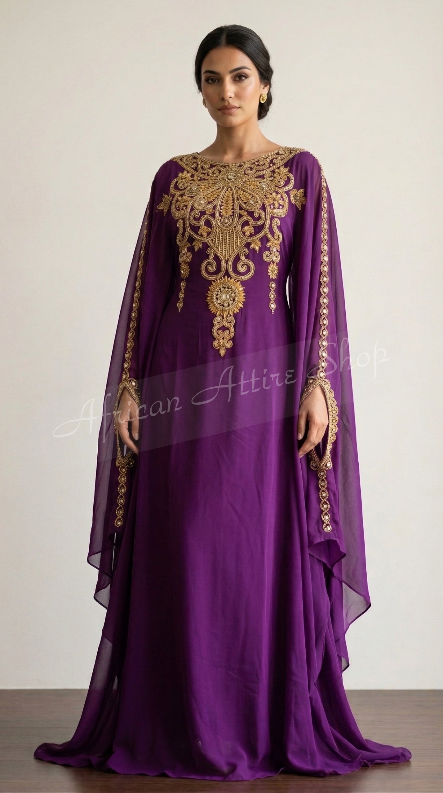 Make a powerful style statement with this royal purple Moroccan kaftan dress, exquisitely detailed with heavy gold embroidery. Designed to reflect luxury and tradition, this Dubai-style kaftan features an ornate embroidered neckline and a bold central motif that enhances its regal appeal. The flowing silhouette paired with sheer cape sleeves creates a graceful, elegant movement, perfect for special occasions. Crafted from premium-quality fabric, it ensures both comfort and sophistication throughout the day or evening. Ideal for weddings, Eid celebrations, formal gatherings, and festive events, this designer kaftan offers a perfect blend of cultural craftsmanship and modern fashion. Elevate your wardrobe with this timeless, luxurious embroidered kaftan designed to turn heads effortlessly.
