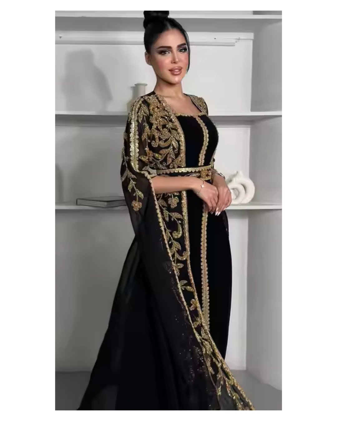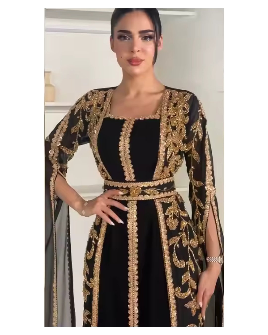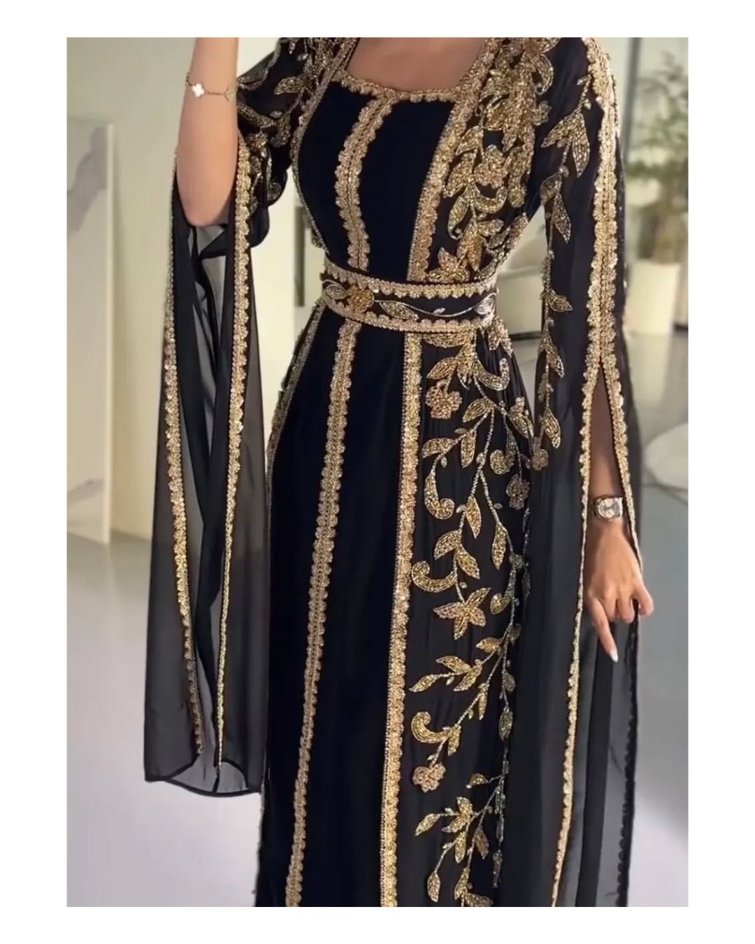 Turn every head with this Black & Gold Moroccan Kaftan, a best-selling piece designed for royalty. Made from premium fabric, the dress features intricate gold embroidery in floral and vine patterns that shimmer with every step. The open drape sleeves add a touch of drama while maintaining modesty, and the tailored belt cinches the waist for a flattering hourglass effect.