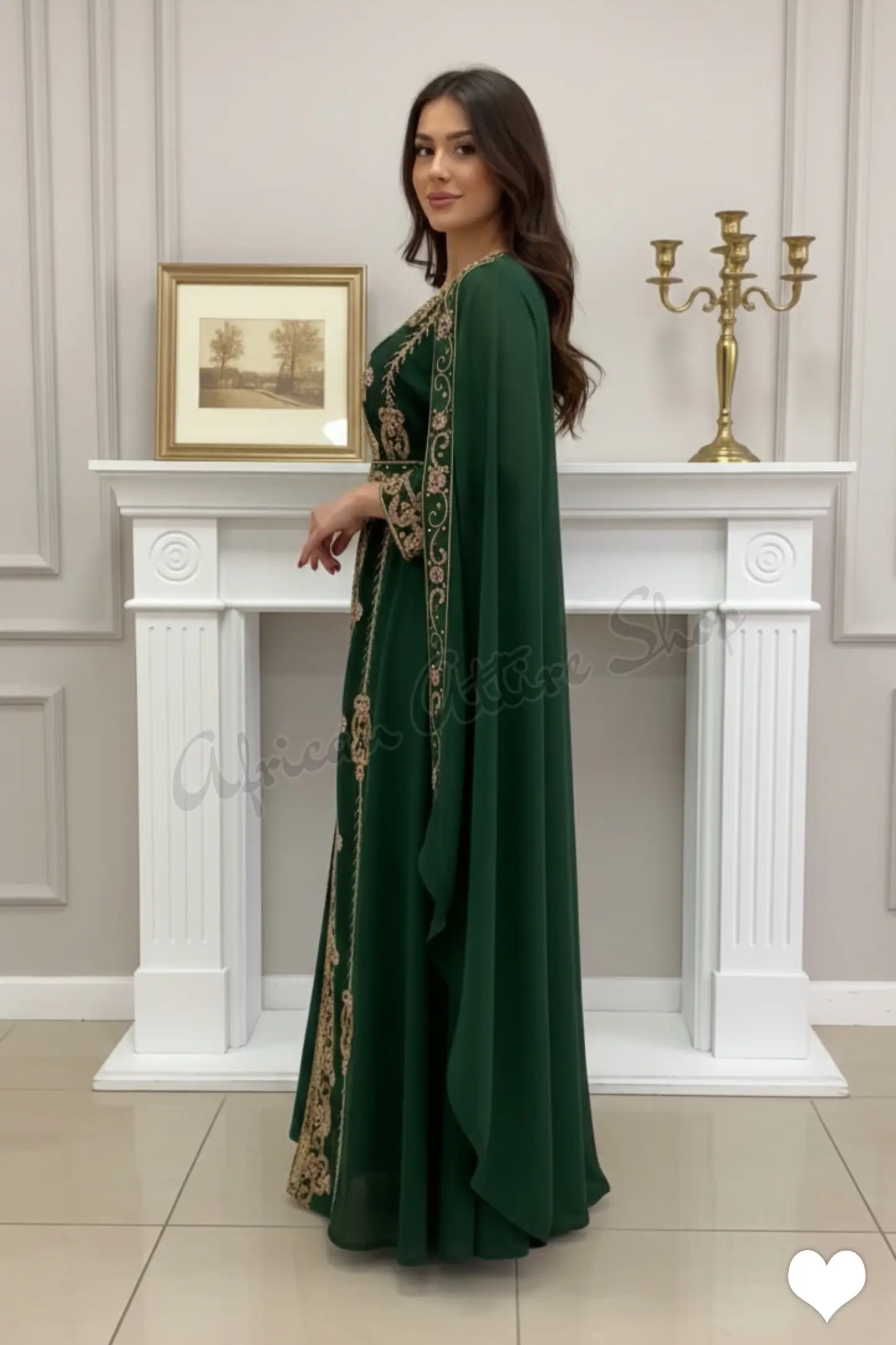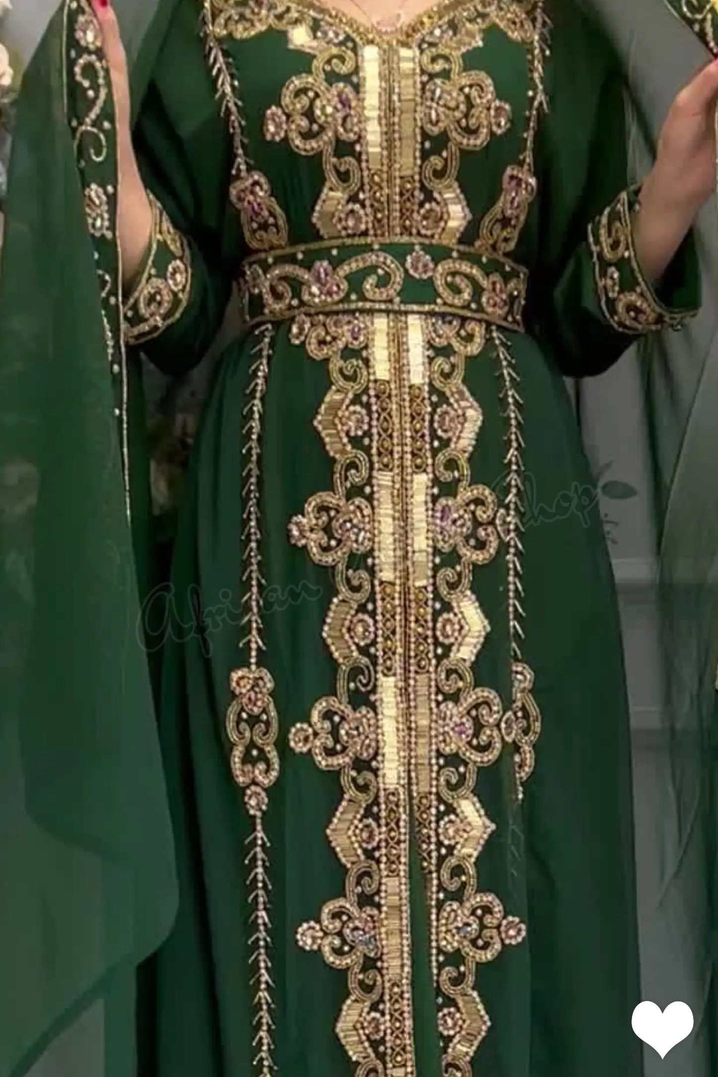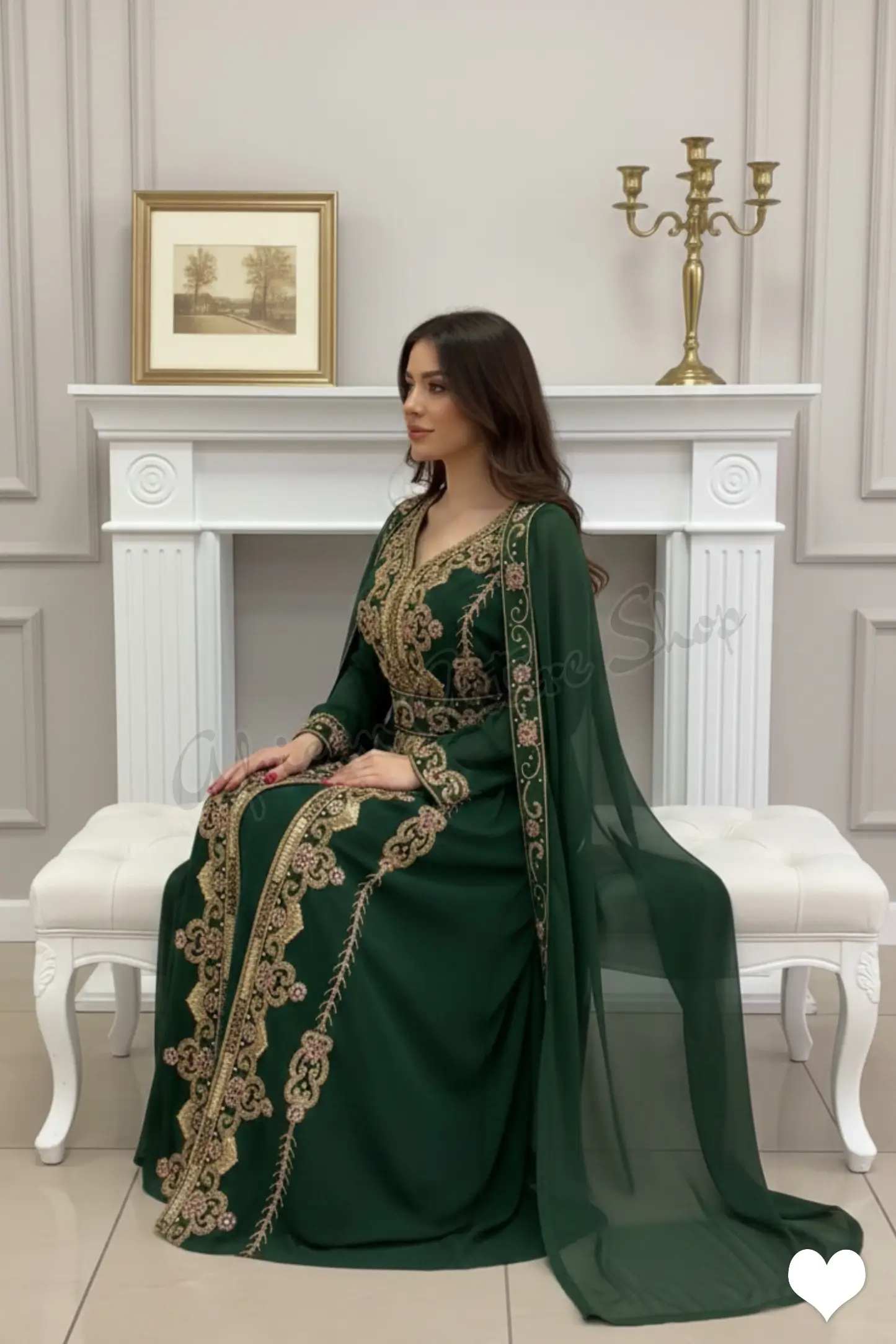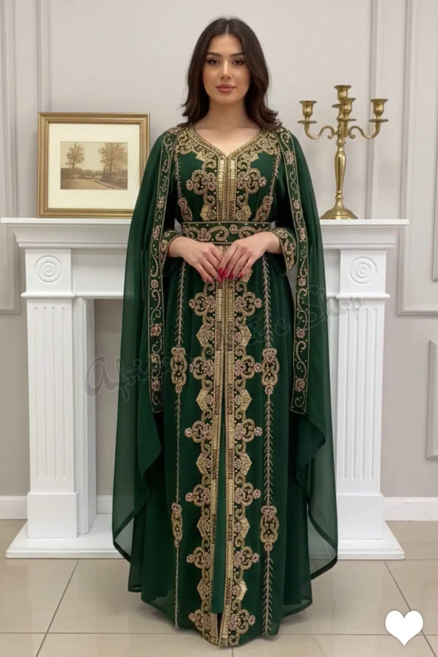 Experience timeless elegance with this Dark Green and Gold Moroccan Kaftan, a masterpiece crafted for women who appreciate luxury modest fashion. Designed using premium flowing georgette, this gown showcases stunning hand-embroidered gold motifs that run along the bodice, sleeves, belt, and full-length panel. The intricate patterns illuminate beautifully against the deep green base, creating a regal and unforgettable evening look.