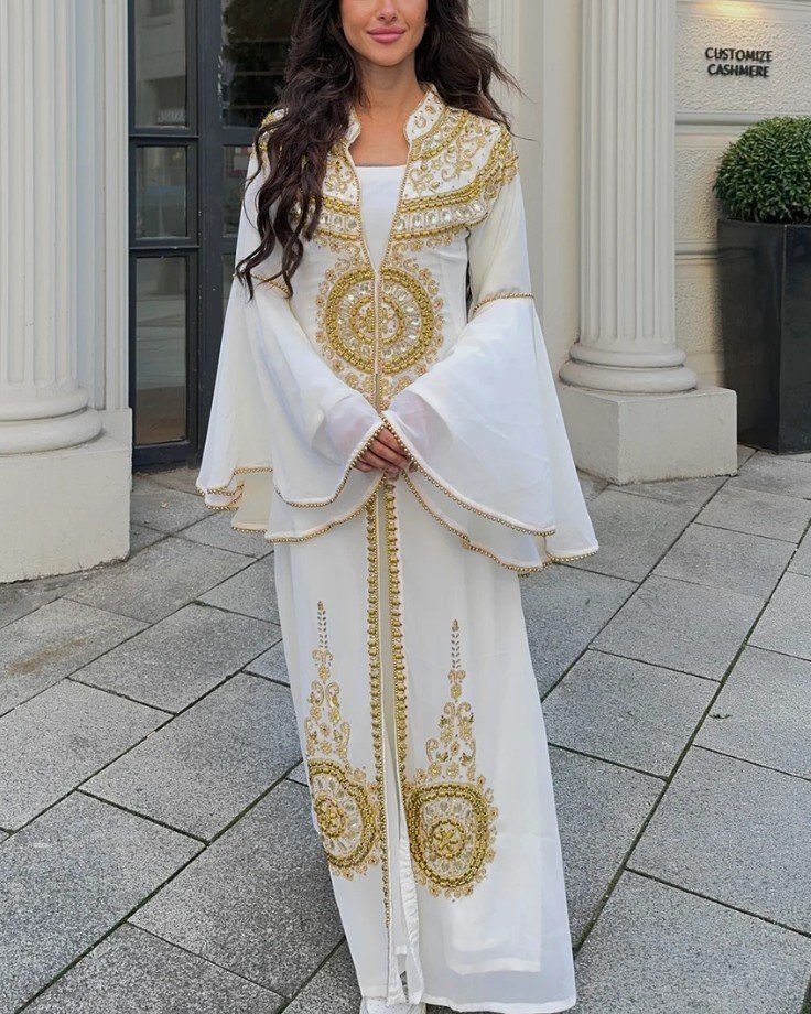 Step into pure elegance with this White and Gold Moroccan Kaftan Dress, a true blend of tradition and modern luxury. Designed with a regal circular medallion embroidery and golden trim along the front, this kaftan is perfect for brides, wedding guests, or festive celebrations. The flared sleeves and clean white silhouette make it a radiant choice for women who want to feel both sophisticated and effortlessly beautiful. This piece is ideal for Eid, nikkah ceremonies, or even as a bridal kaftan.