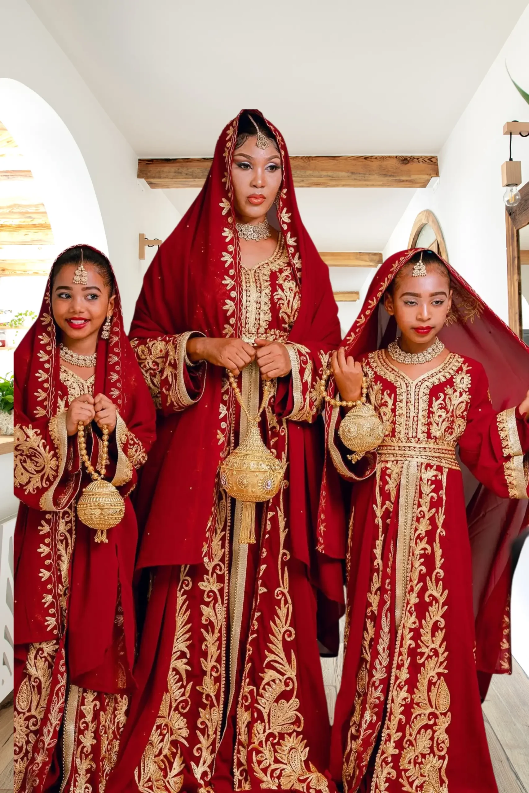 Designed for both women and young girls, this matching family set is perfect for special occasions like weddings, Eid, engagements, and cultural celebrations. The adjustable waist belt enhances the silhouette, while the long flowing sleeves and hooded scarf add an extra touch of sophistication.