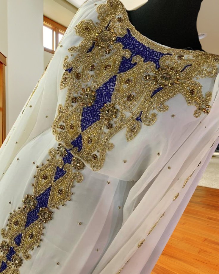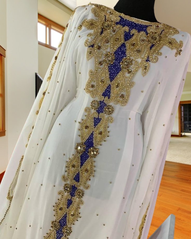 Grace meets grandeur in this White Moroccan Kaftan Dress adorned with exquisite hand embroidery in royal blue and gold. The long, flowing silhouette and delicate embellishments make it a standout piece for festive gatherings, weddings, and cultural celebrations. Designed for comfort and regal elegance, this kaftan is a must-have in your traditional wardrobe.