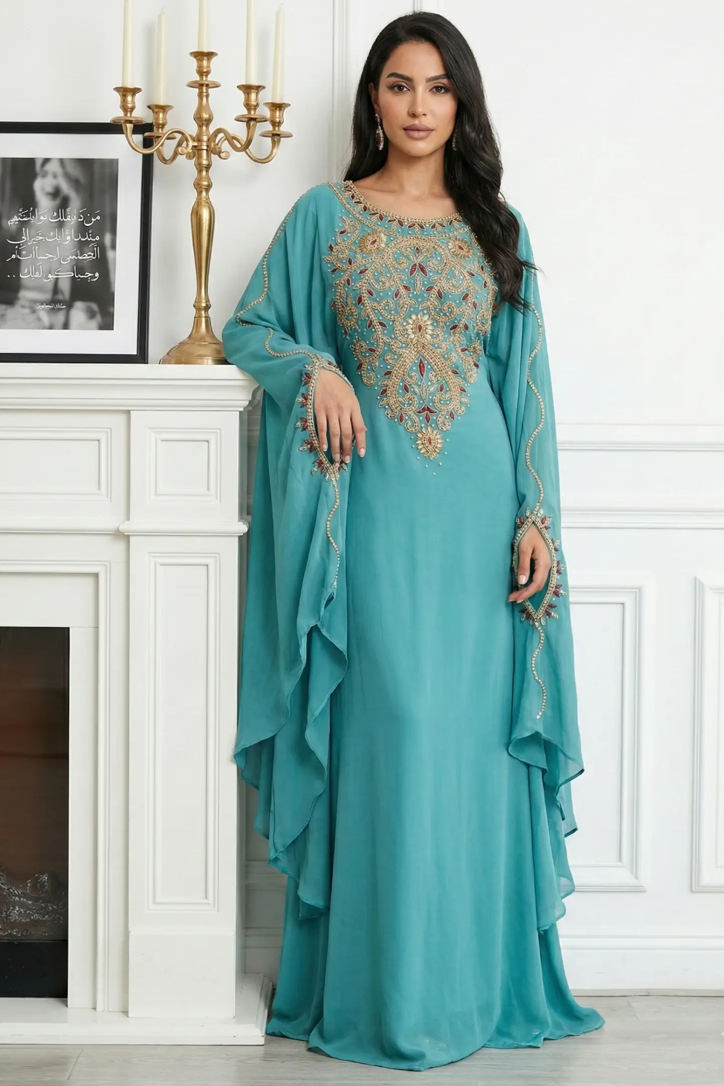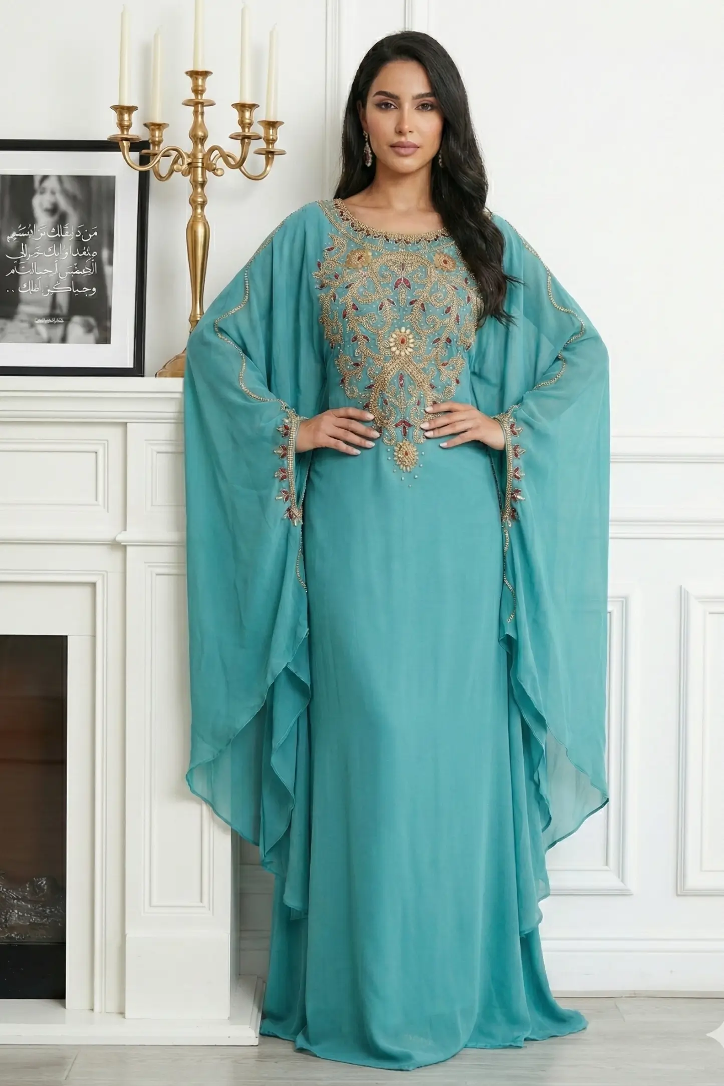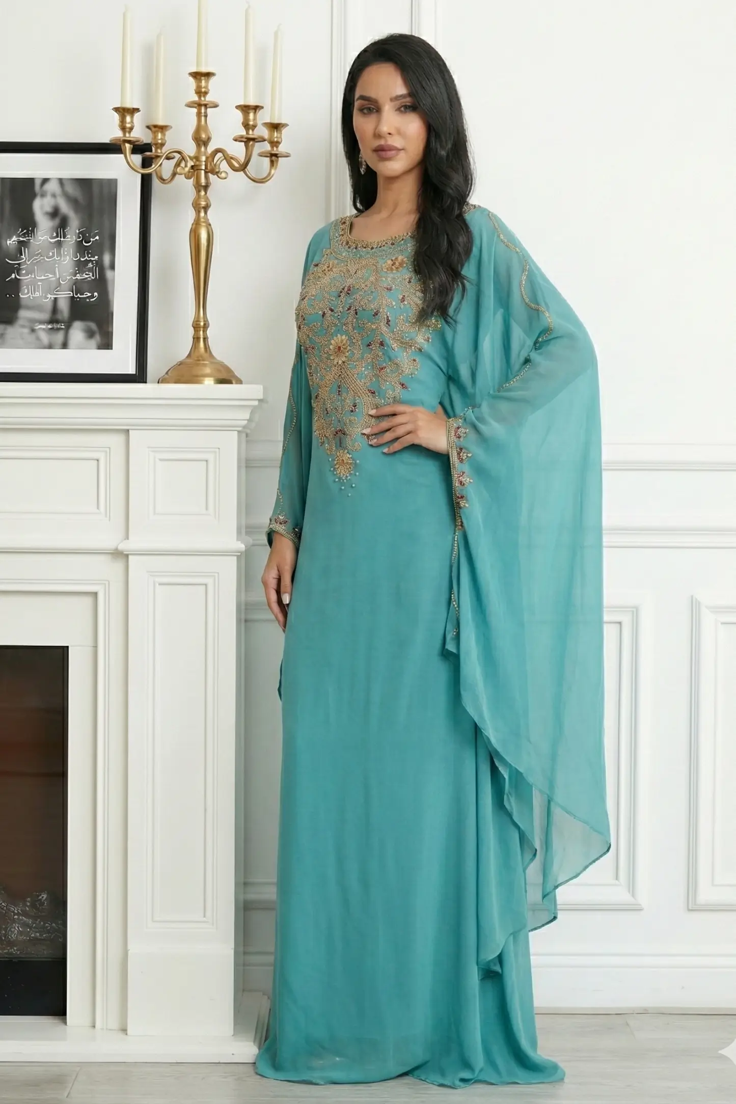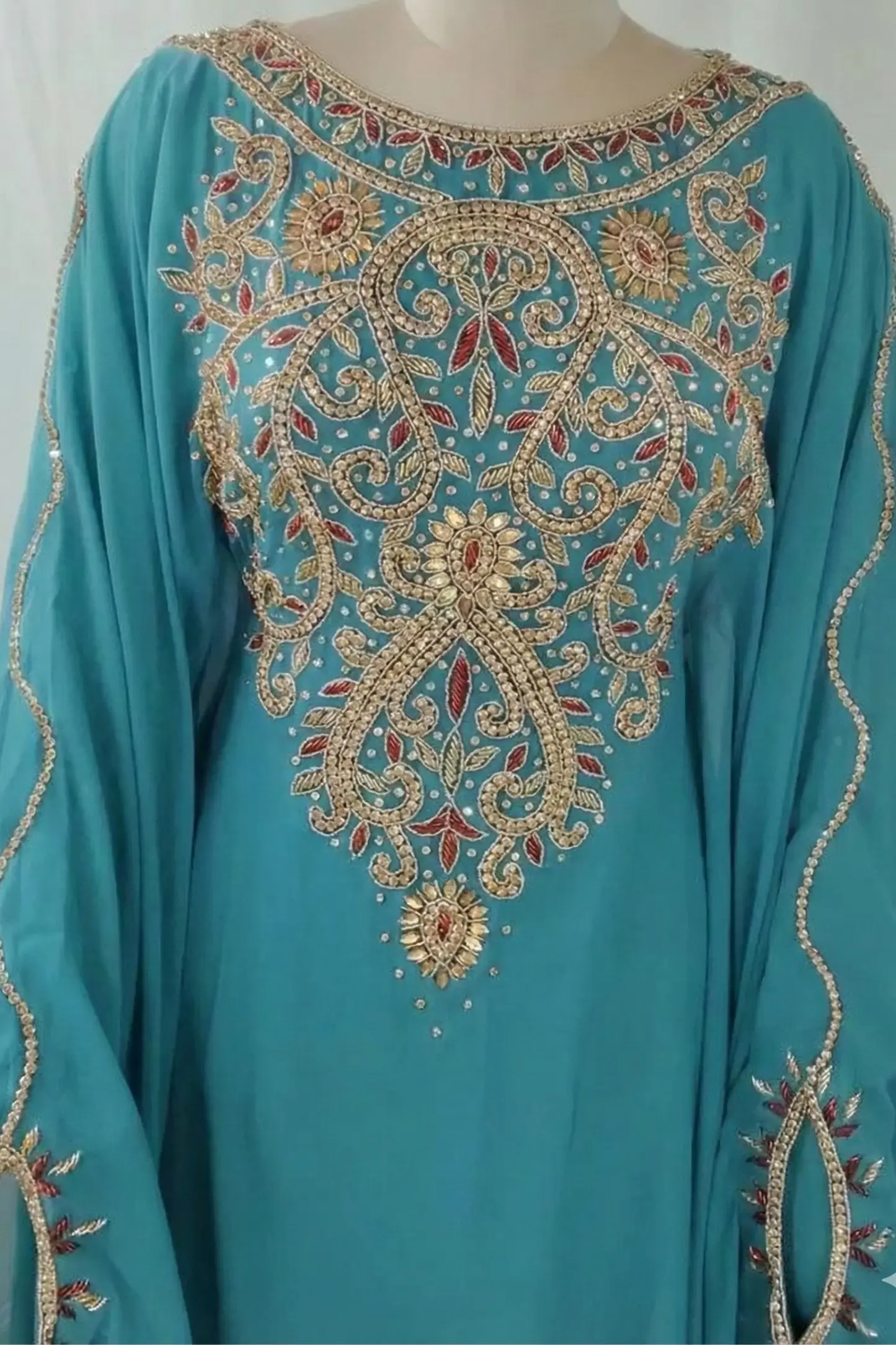 Elevate your modest wardrobe with this Teal Gold Embroidered Moroccan Kaftan, a perfect blend of elegance, comfort, and luxury craftsmanship. Crafted from premium lightweight georgette, this kaftan flows beautifully while offering breathable comfort for long wear. The rich teal base is adorned with intricate gold hand embroidery across the neckline, chest, sleeves, and cuffs, creating a refined and regal appearance.