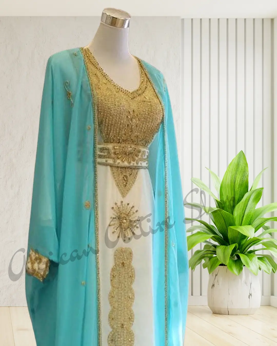 This Turquoise Blue Moroccan Kaftan is a masterpiece of elegance, blending tradition with modern luxury. Featuring intricate gold hand embroidery, a beautifully adorned bodice, and an open-front cape, this kaftan exudes sophistication. The golden belt enhances the silhouette, offering a structured yet flowing look. Made from premium georgette, it provides a soft, airy feel, making it ideal for weddings, parties, or special occasions. Step into royalty with this breathtaking Moroccan gown.