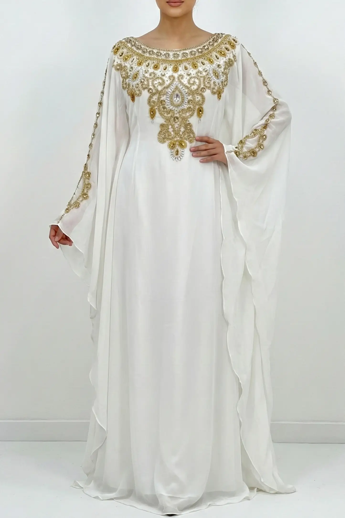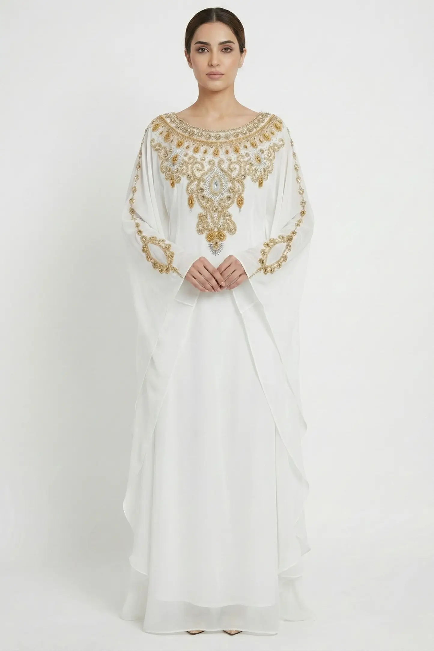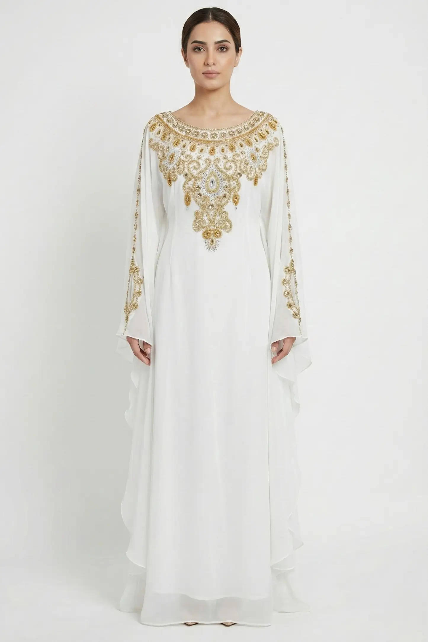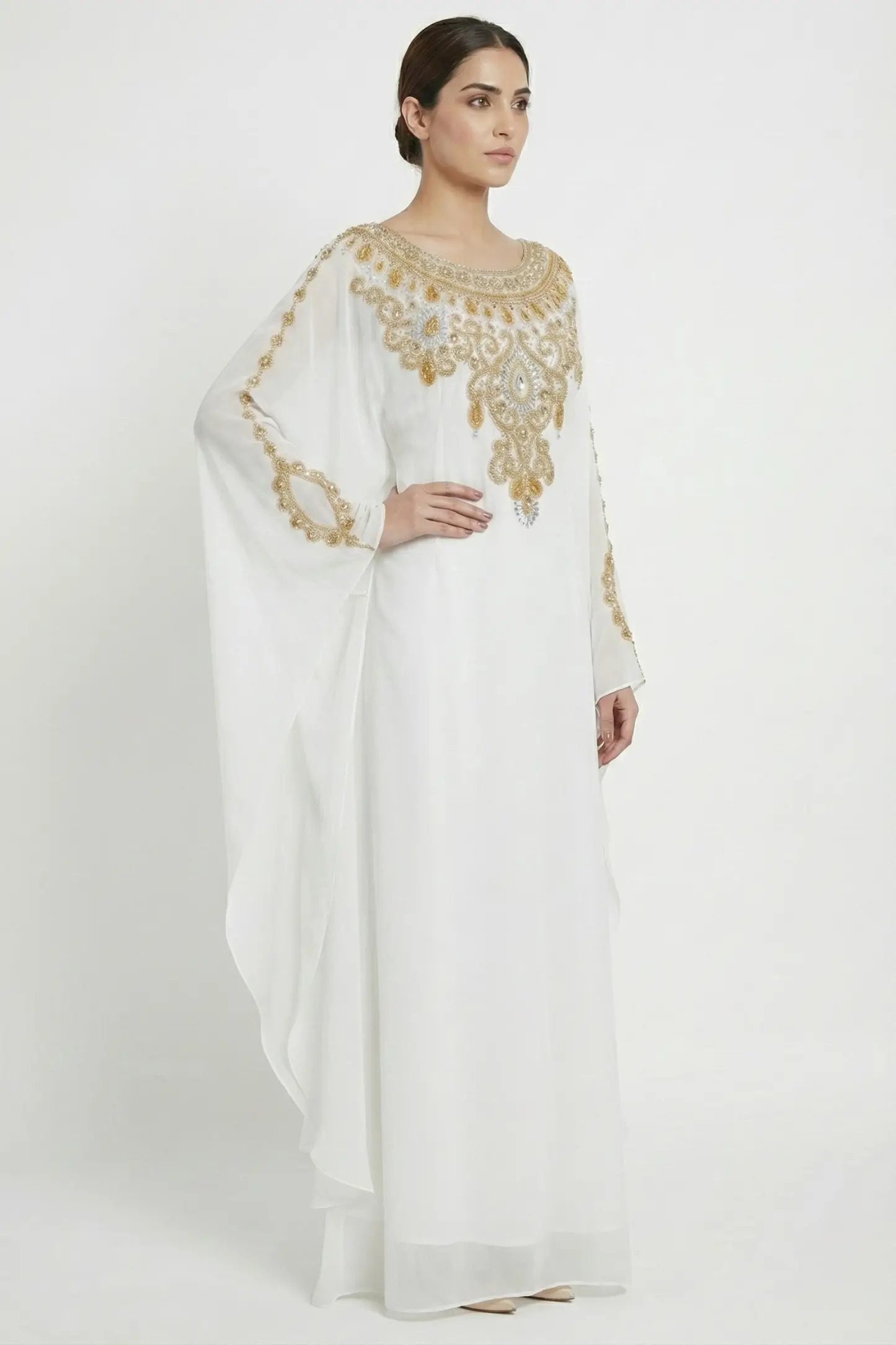 Radiate elegance and timeless beauty with this White Gold Embellished Moroccan Kaftan, designed for women who appreciate refined luxury and graceful modest fashion. Crafted from premium lightweight georgette, this kaftan drapes effortlessly, creating a soft and ethereal silhouette.