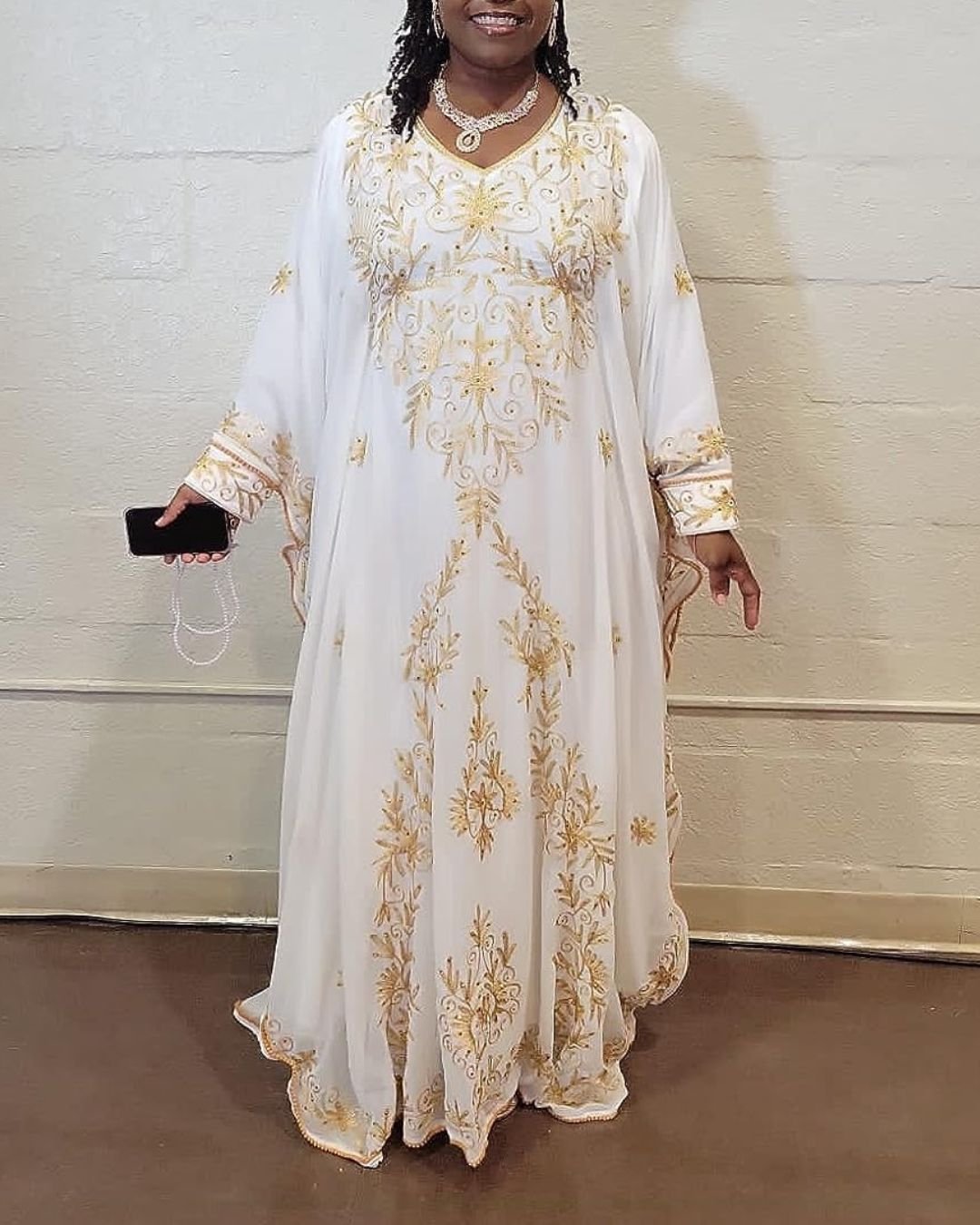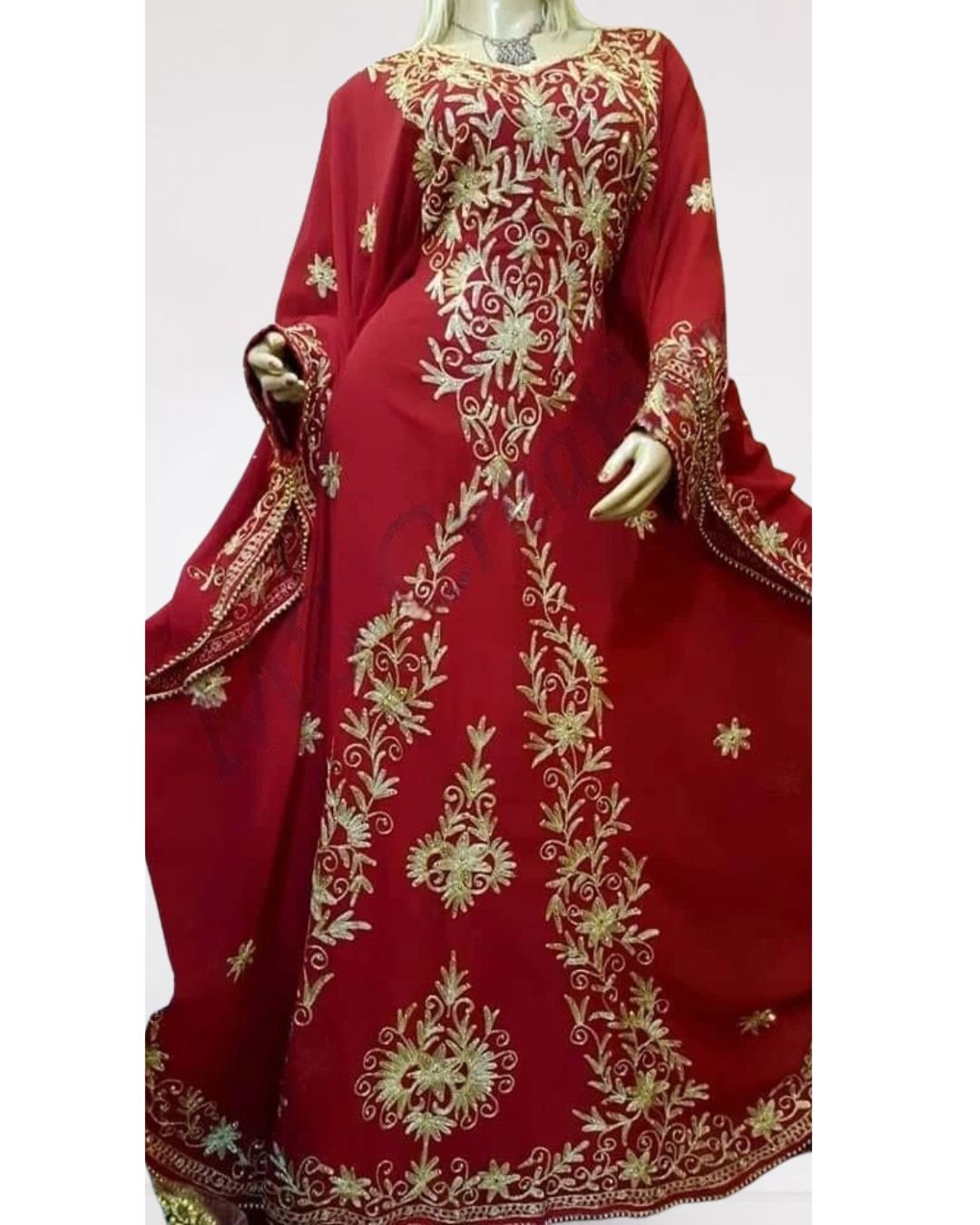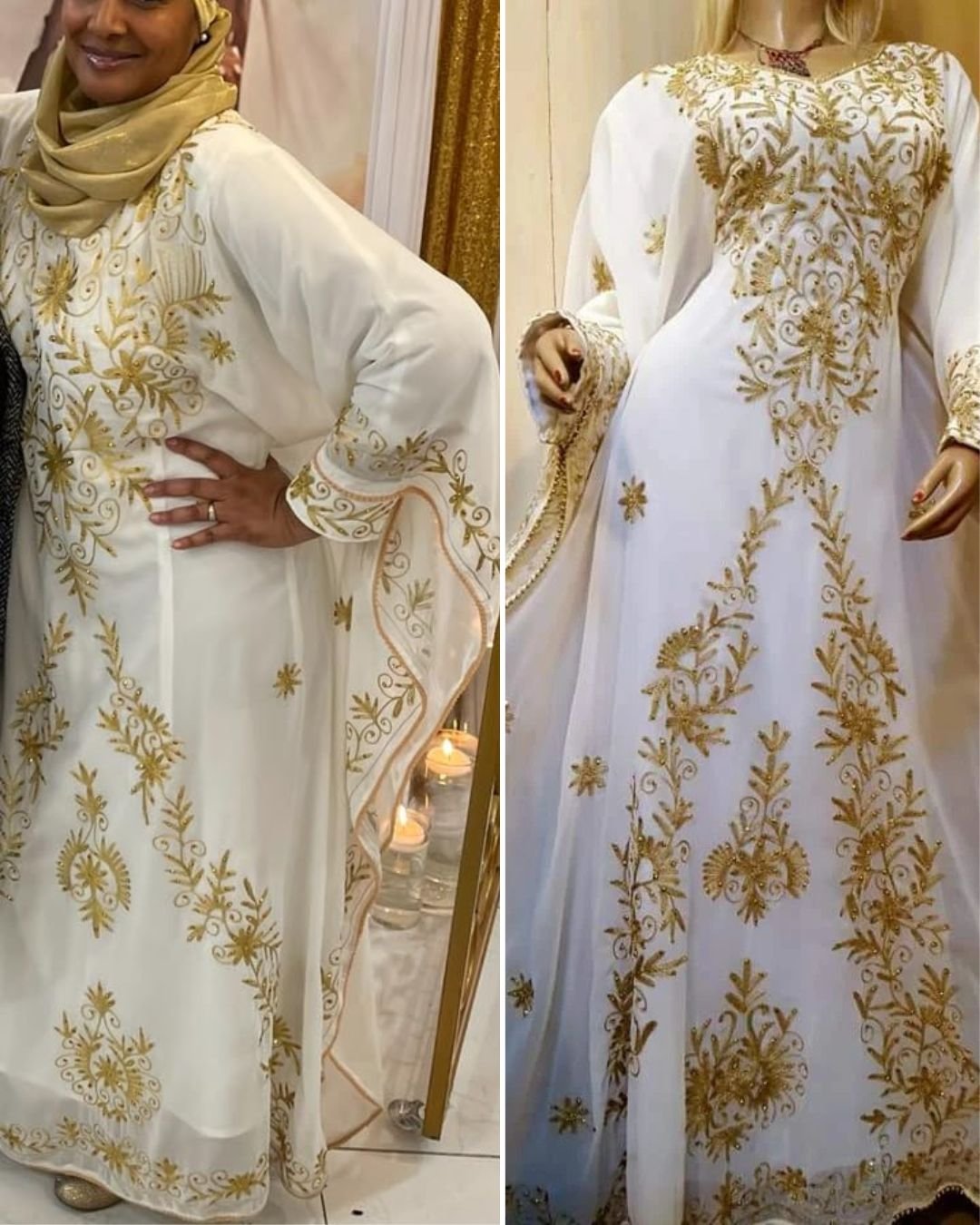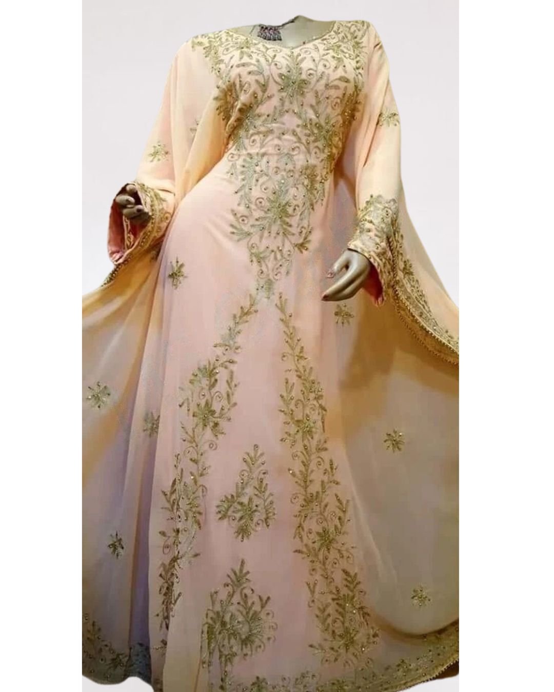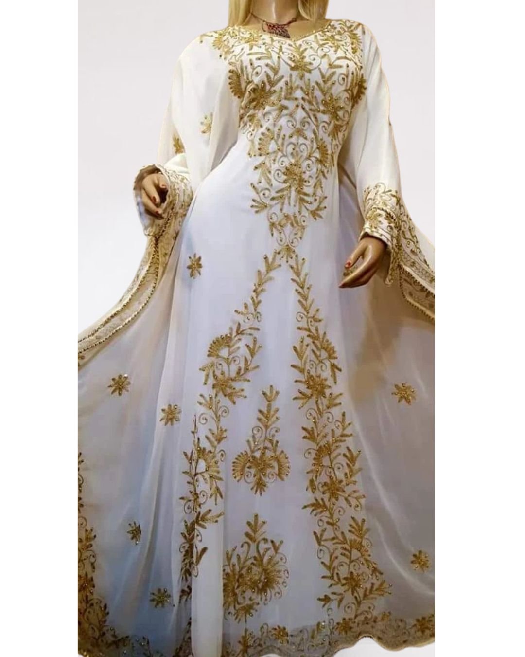 Step into timeless grace with this White and Gold Aari Embroidered Georgette Kaftan Dress—a celebration of modesty, tradition, and elegance. Crafted from soft, high-quality georgette, this kaftan is adorned with luxurious hand-stitched golden embroidery from neckline to hem, creating a regal and refined look.