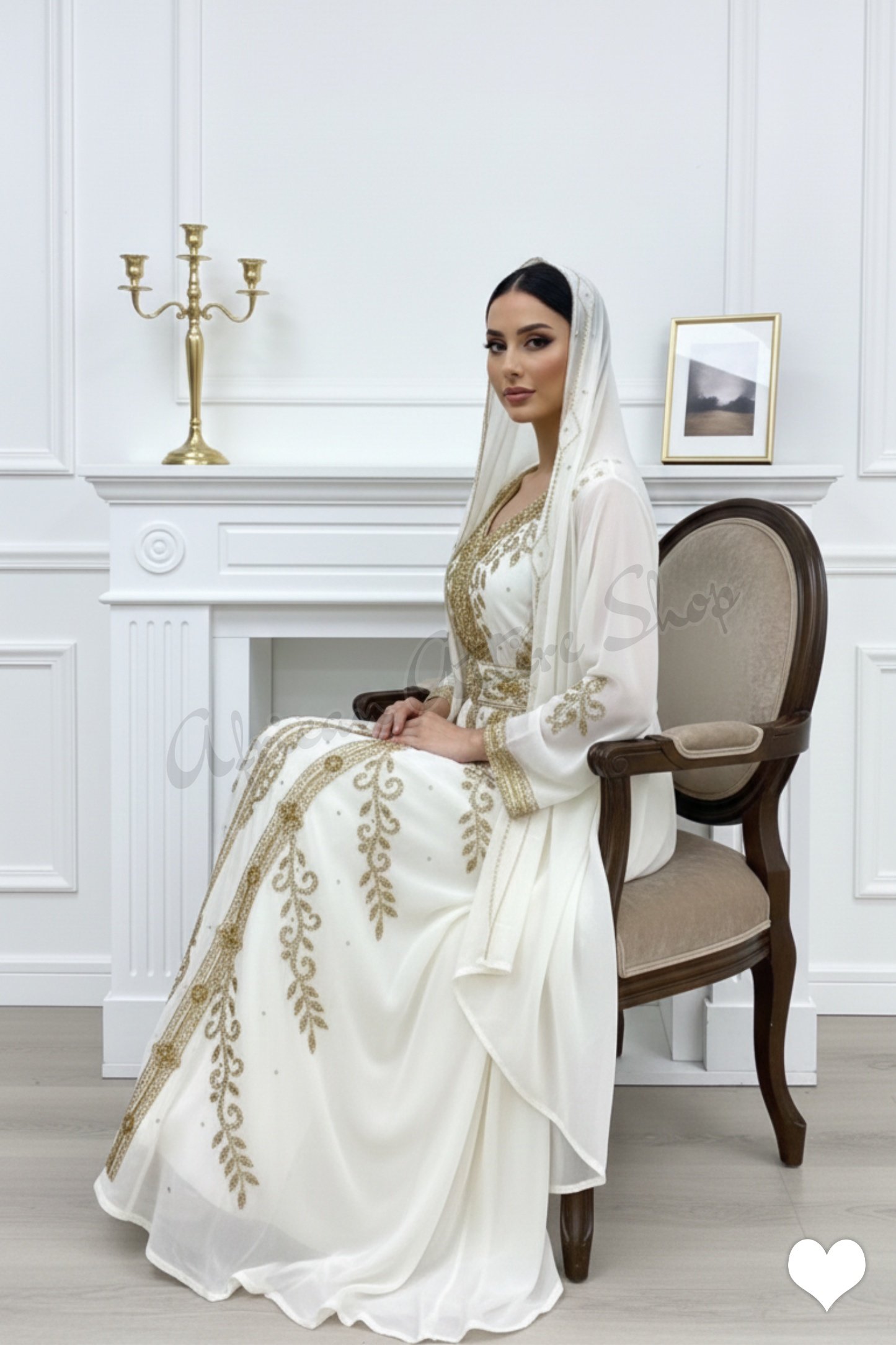 Step into timeless bridal elegance with this White and Gold Moroccan Bridal Kaftan with Veil, designed for brides who desire luxury, modesty, and tradition. Crafted from premium lightweight georgette, this stunning wedding kaftan features intricate hand-embroidered gold detailing across the neckline, bodice, waist belt, sleeves, and full-length front panel. The delicate gold embroidery shimmers beautifully against the soft white fabric, creating a graceful and refined bridal silhouette.