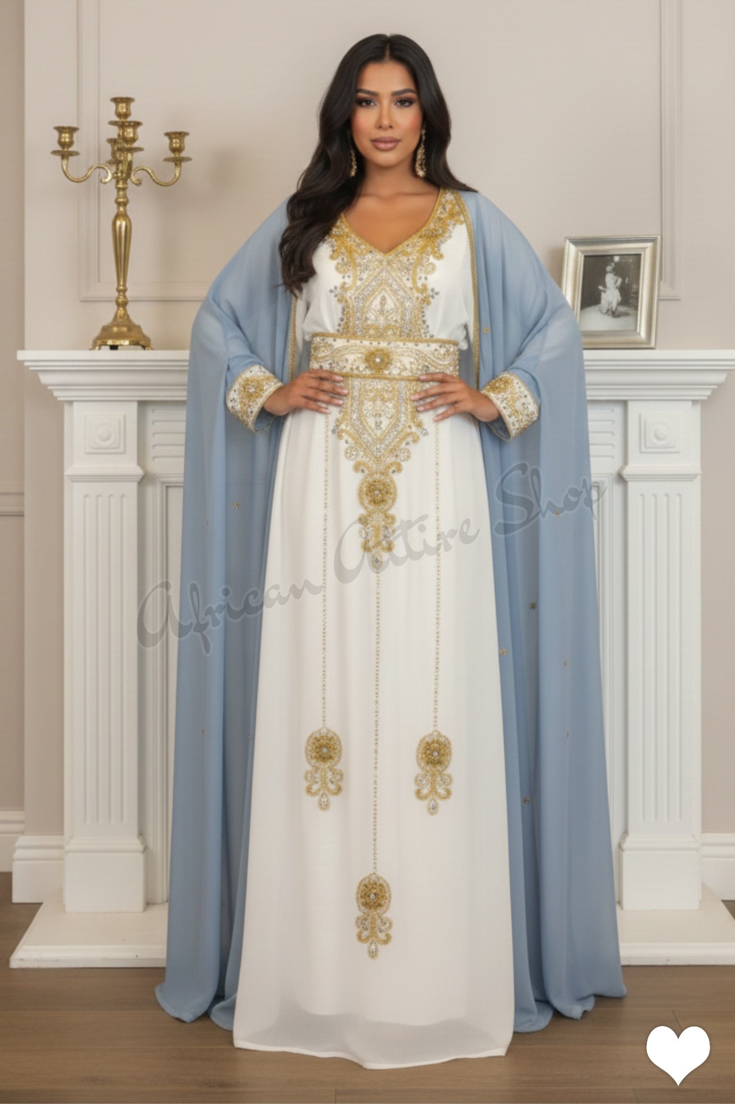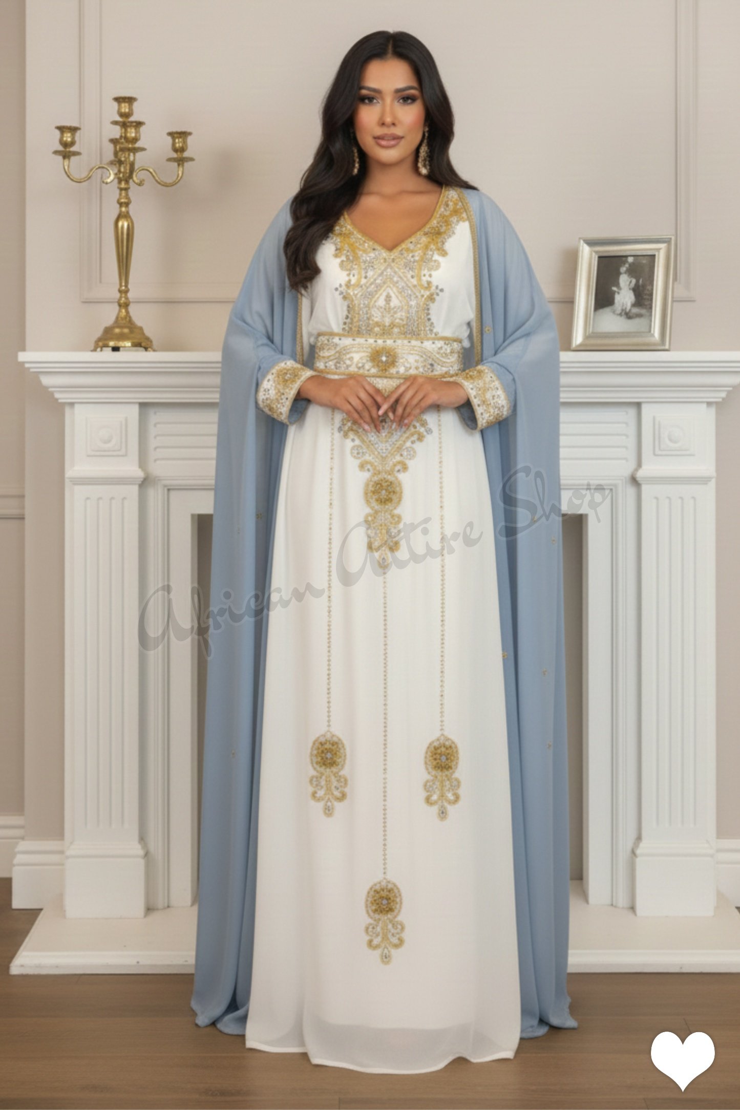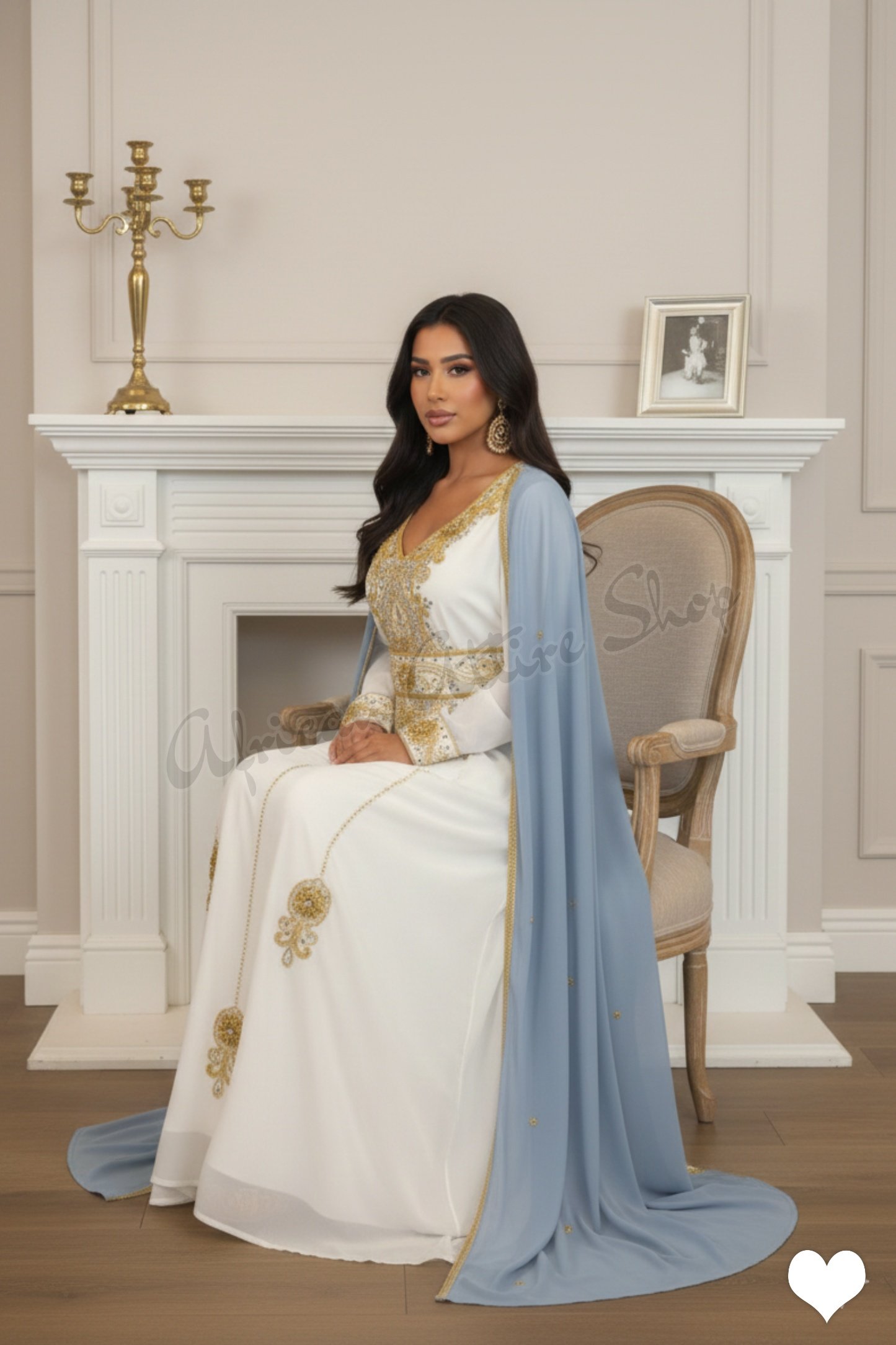 Step into timeless elegance with this White and Gold Moroccan Kaftan paired with a delicate Sky Blue Cape, designed for brides and women seeking refined modest luxury. Crafted from premium lightweight fabric, the inner white kaftan features intricate gold embroidery along the neckline, bodice, waist belt, and flowing front panel. The detailed gold motifs create a radiant contrast against the soft white base, offering a sophisticated bridal and evening look.