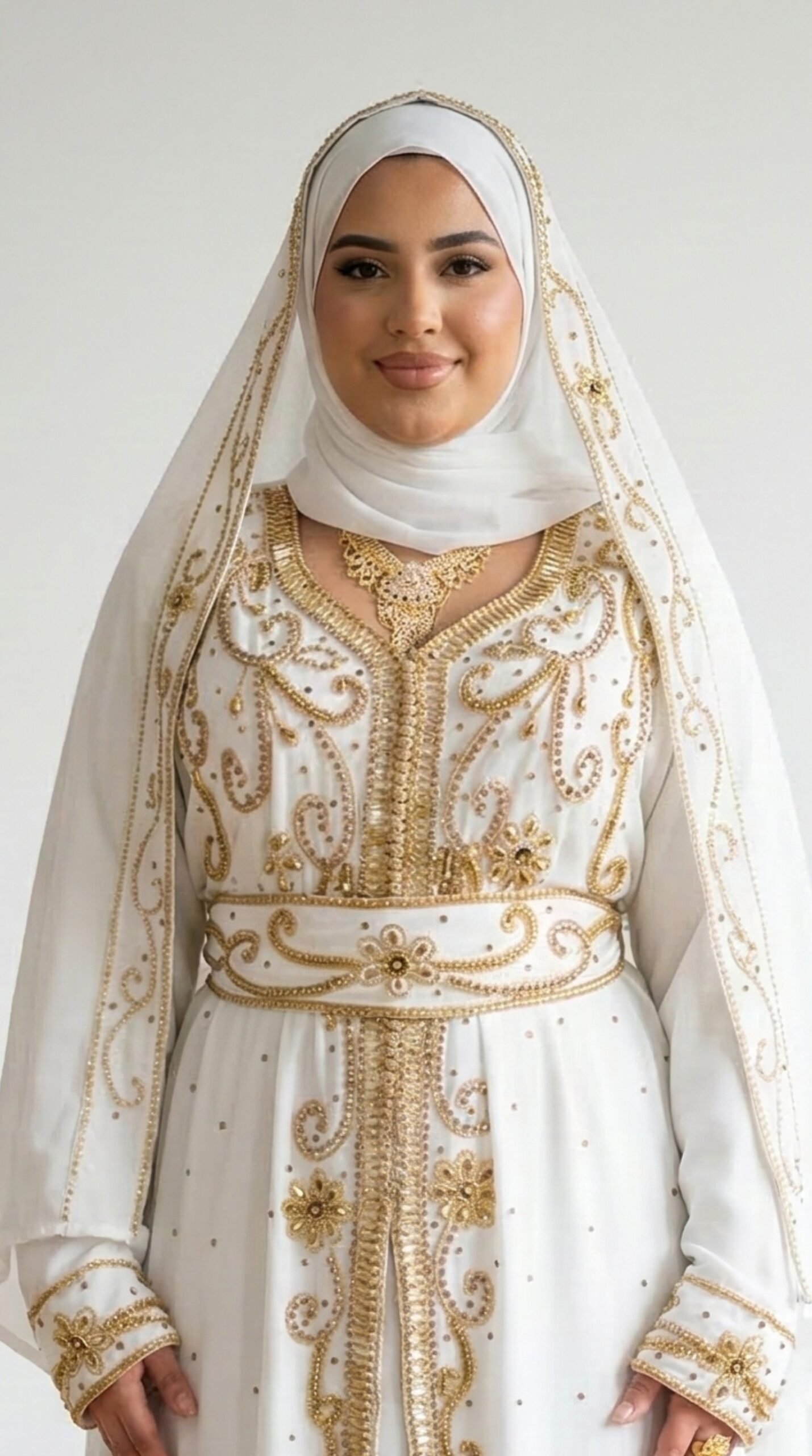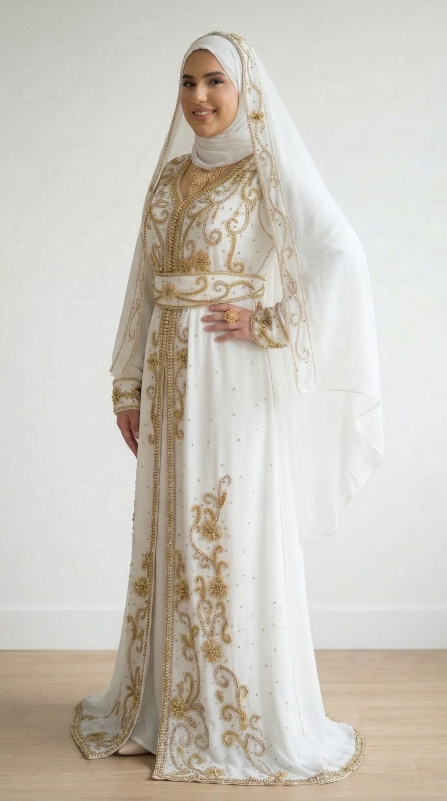 Embrace timeless modest elegance with this white Moroccan bridal kaftan adorned with delicate gold embroidery. Designed for the modern modest bride, this luxurious ensemble features intricate hand embellishments across the neckline, sleeves, waist, and full-length front panel. The included embroidered belt enhances the silhouette while maintaining graceful coverage. Paired with a matching scarf, this kaftan creates a complete, sophisticated bridal look ideal for Nikkah ceremonies, Islamic weddings, Eid celebrations, and formal occasions. The soft white fabric symbolizes purity, beautifully complemented by shimmering gold embroidery. Crafted from premium lightweight material, this kaftan offers comfort, elegance, and fluid movement—perfect for your most special day.
