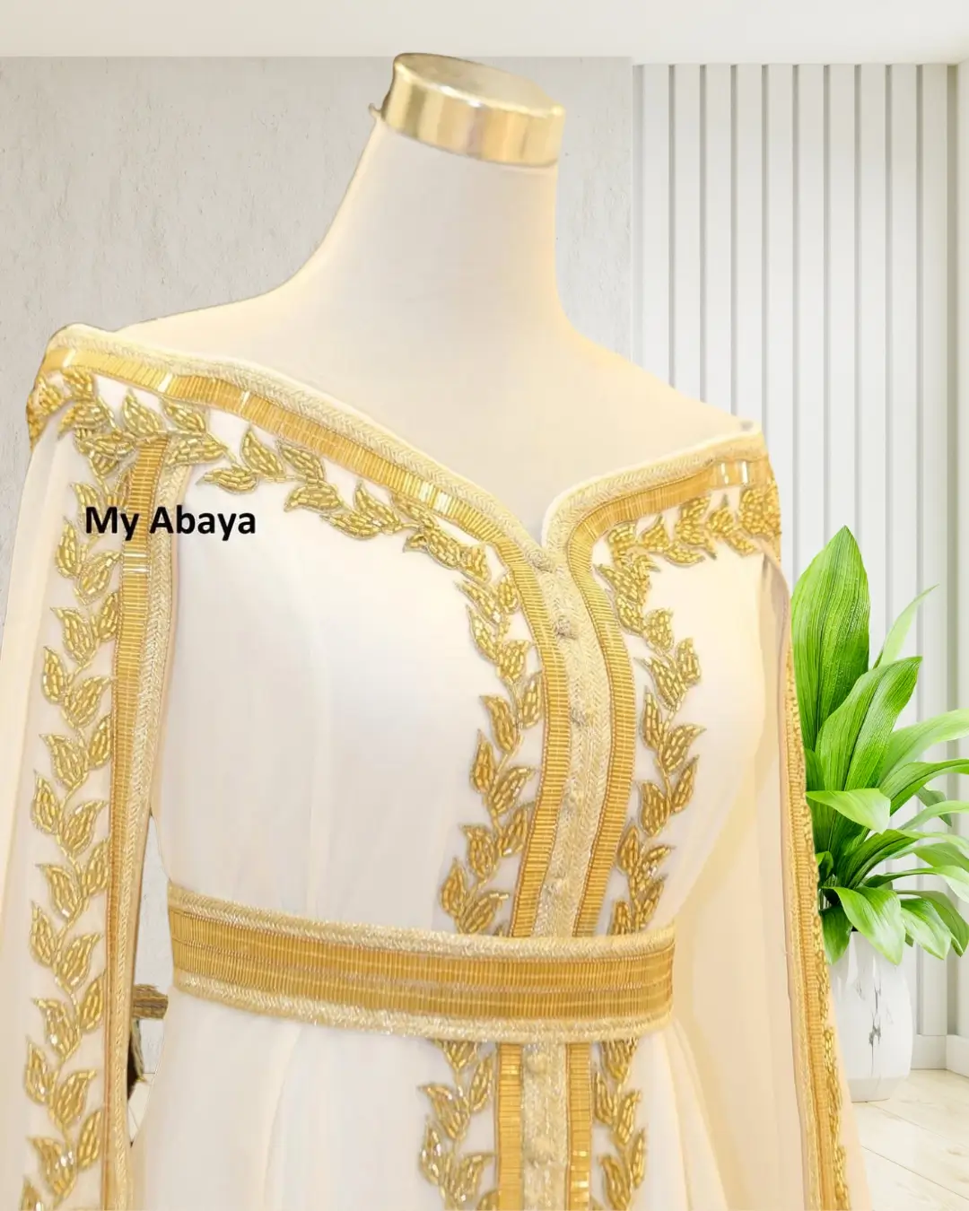 Embrace timeless elegance with this White Moroccan Bridal Kaftan, designed for brides who want a regal yet graceful look. Featuring handcrafted gold embroidery and intricate embellishments, this kaftan blends tradition with modern sophistication. The off-shoulder design and flowing cape sleeves add a touch of royalty, making it a perfect choice for weddings, engagements, and special celebrations. Made from luxurious georgette fabric, this dress ensures both comfort and style on your big day.