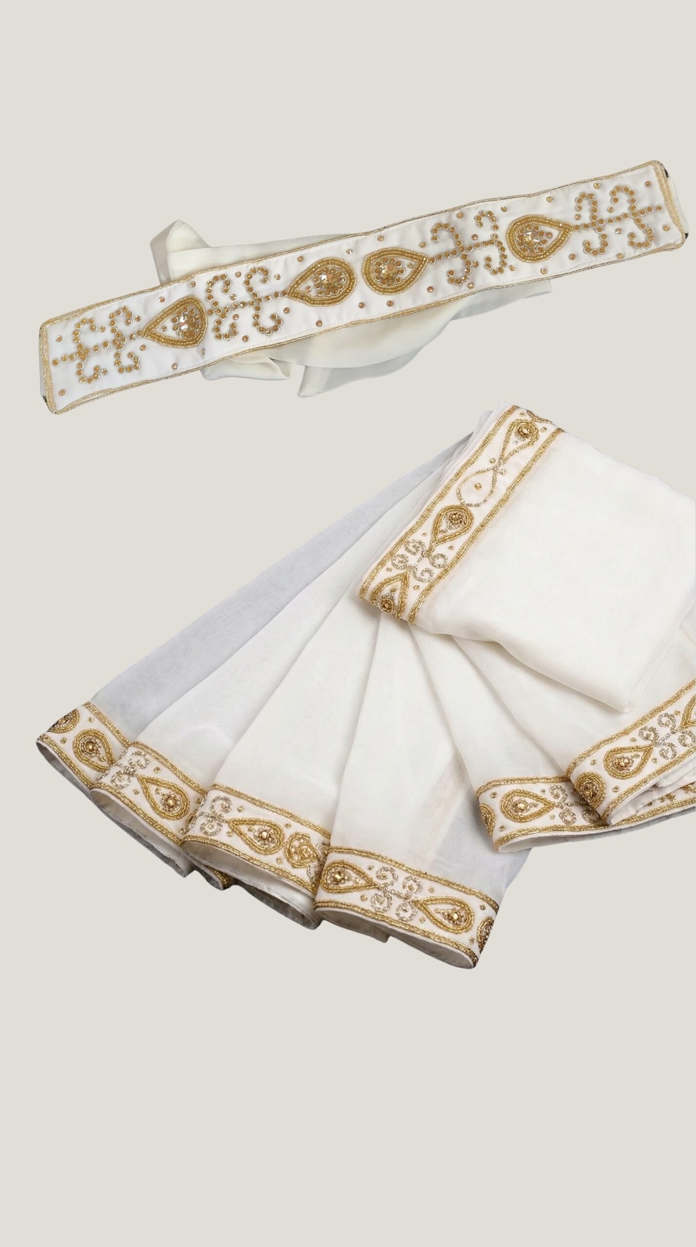 Crafted from premium flowing georgette fabric, this kaftan features intricate hand-embroidered gold patterns along the front and sleeves, inspired by traditional Moroccan artistry. The refined detailing creates a regal, graceful silhouette perfect for bridal wear or luxury evening styling.
