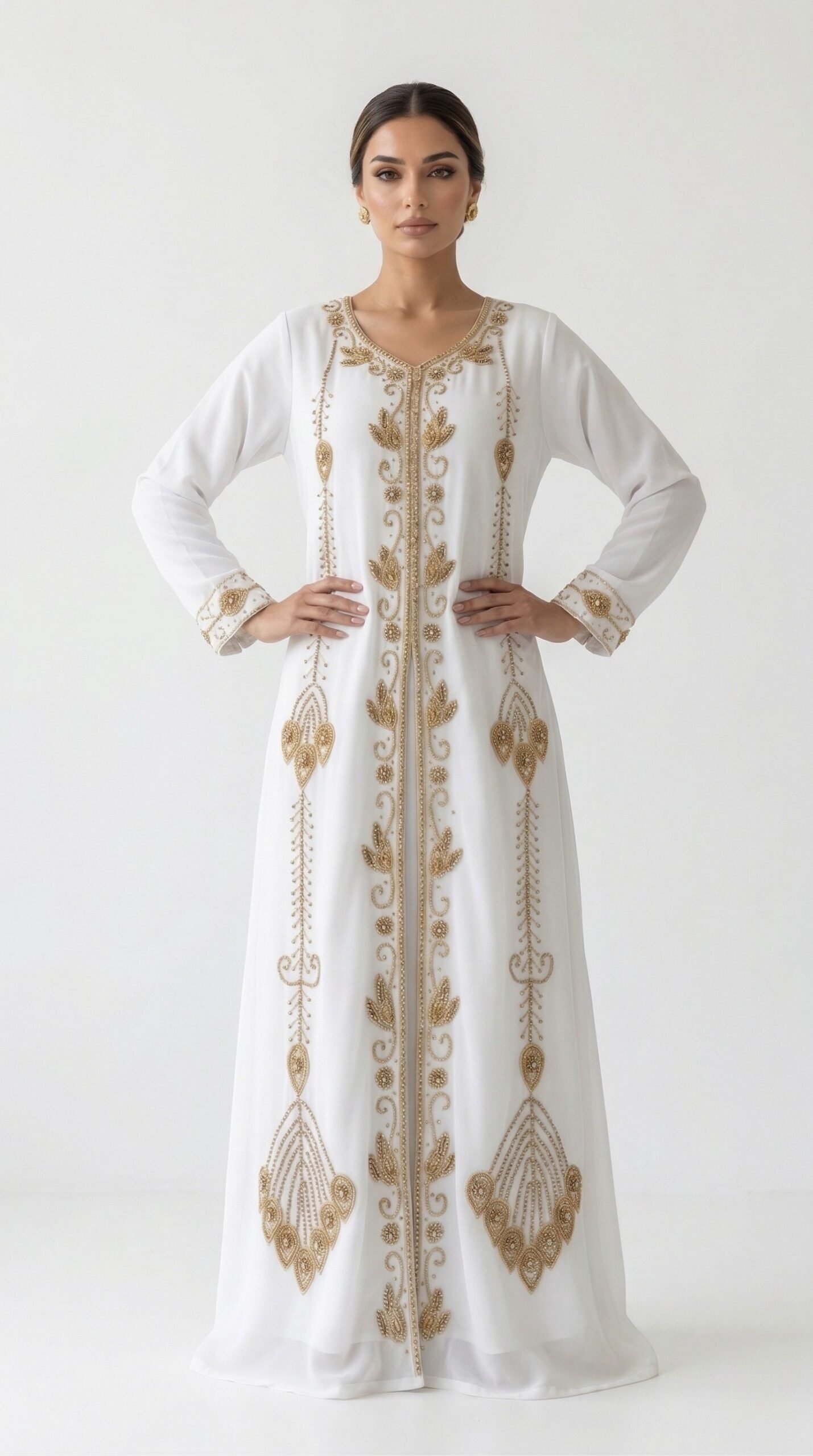 Make a statement with this luxury white Moroccan kaftan dress, designed for brides, special occasions, and elegant celebrations. This Dubai-style kaftan with gold embroidery blends timeless tradition with modern sophistication, making it a standout piece for weddings, Eid, and formal events.