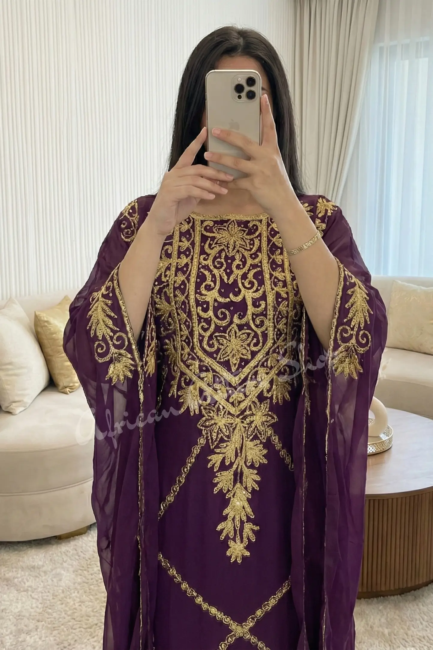 This stunning Purple Gold Embroidered Kaftan, a masterpiece of modest fashion. Crafted from high-quality, flowy georgette chiffon, this luxurious Dubai-style Jalabiya features intricate Zari gold embroidery and delicate embellishments that shimmer under evening lights. The elegant Farasha butterfly cut offers a comfortable, flattering silhouette perfect for wedding guests, Ramadan 2025, or Henna parties.